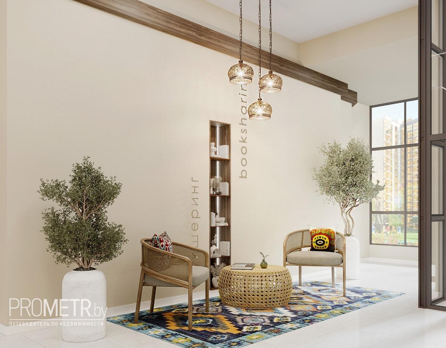 Дом с дизайнерским лобби со стеллажом для букшеринга. Здесь можно отдохнуть либо провести переговоры и встречи.