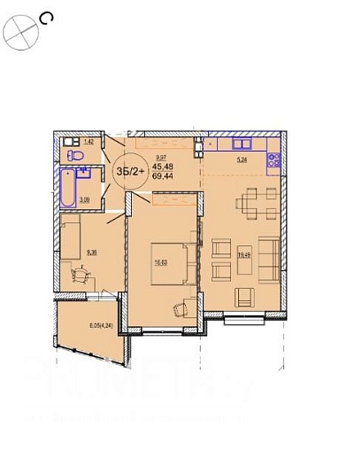 Площадь: 69.44 / 45.48 м²