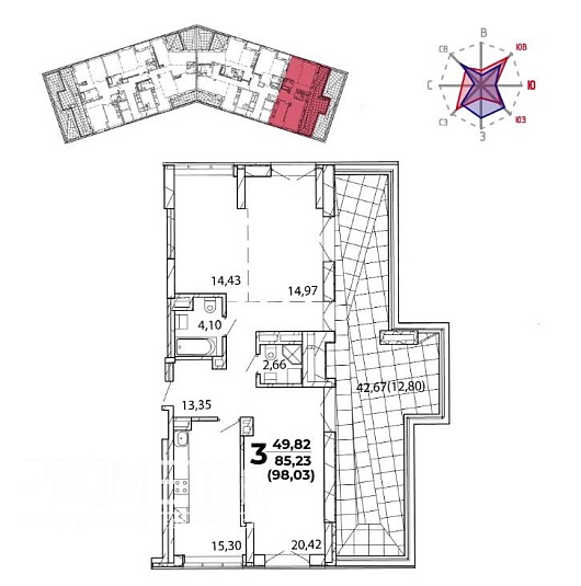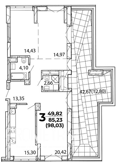 Площадь: 98.03 / 49.82 / 15.3 м²
