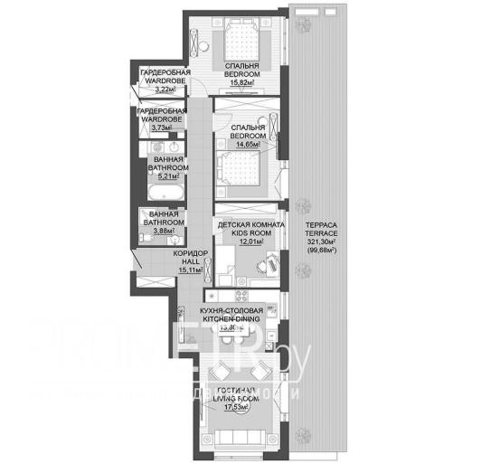 Квартира без отделки с террасой. На момент ввода квартира является однокомнатной с возможностью разделения на комнаты по индивидуальному проекту будущего собственника.