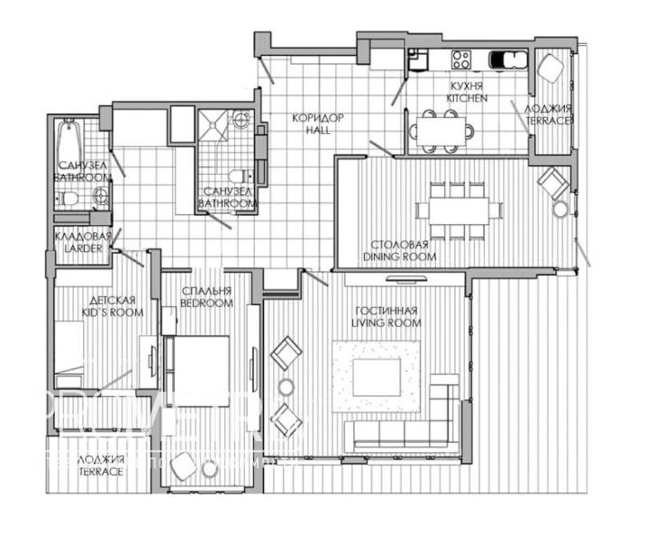 Квартира без отделки с террасой. На момент ввода квартира является однокомнатной с возможностью разделения на комнаты по индивидуальному проекту будущего собственника.