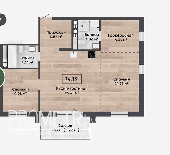 Продается 3-комнатная квартира, 74.12м2, ЖК «Зеленая гавань»