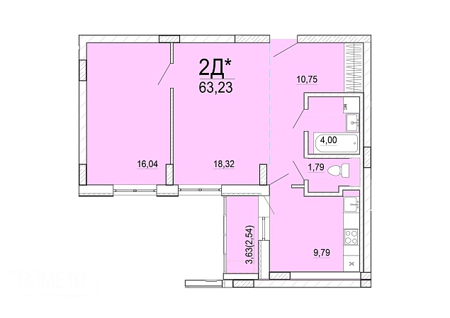 Площадь: 63.23 / 34.36 / 9 м²
