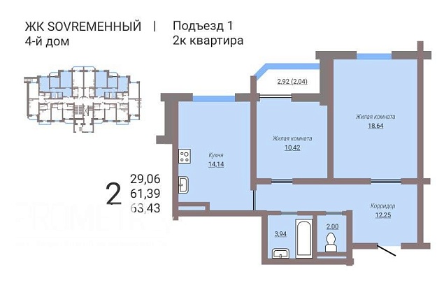 Продается 2-комнатная квартира, 63.43м2, ЖК «Современный»