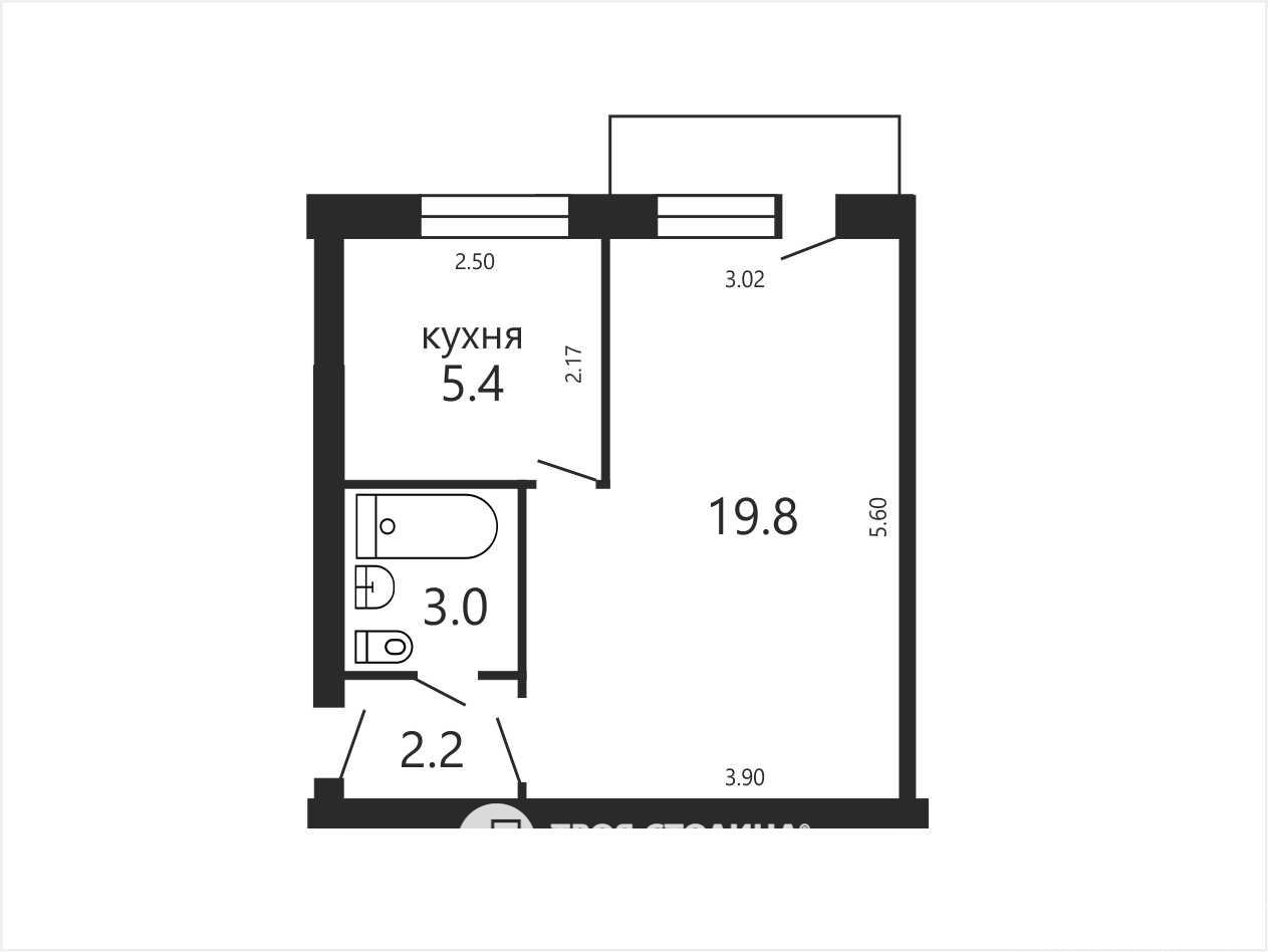 Жилая площадь - 19,8 кв.м., кухня - 5,4 кв.м.