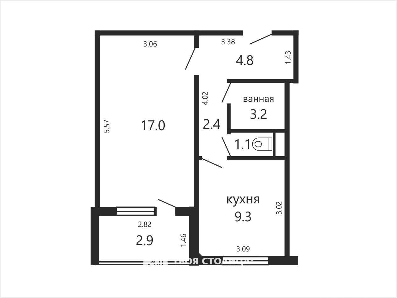 Общая площадь по СНБ — 40,7 м², жилая — 17 м², кухня — 9,3 м².