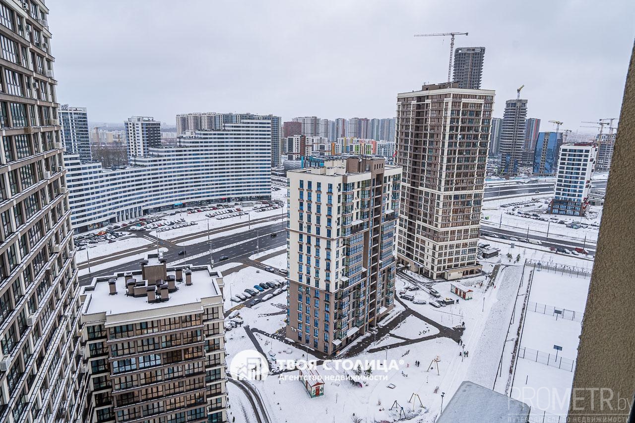 Квартира расположена на 20-ом этаже в каркасно-блочном доме 2022 года постройки. Из-за расположения квартиры на высоком этаже - открывается прекрасный вид из окон на панораму столицы, Национальной Библиотеки и стадиона «Трактор», а вечером, когда работает подсветка – вид становится ещё фееричней!