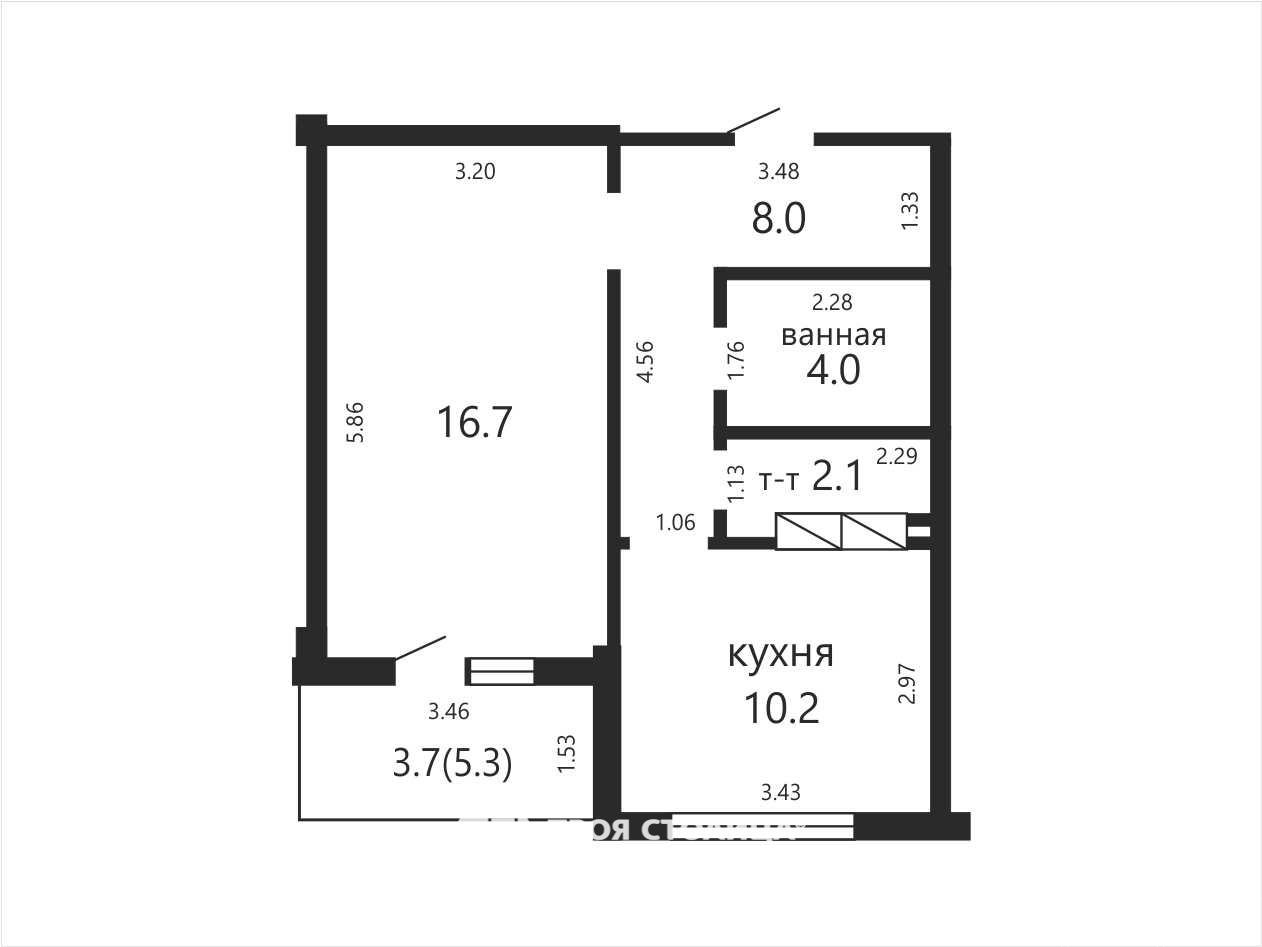 Площадь по СНБ: 46.7. Общая площадь: 43. Жилая площадь: 18.7. Площадь кухни: 10.2. Высота потолка: 2.53.