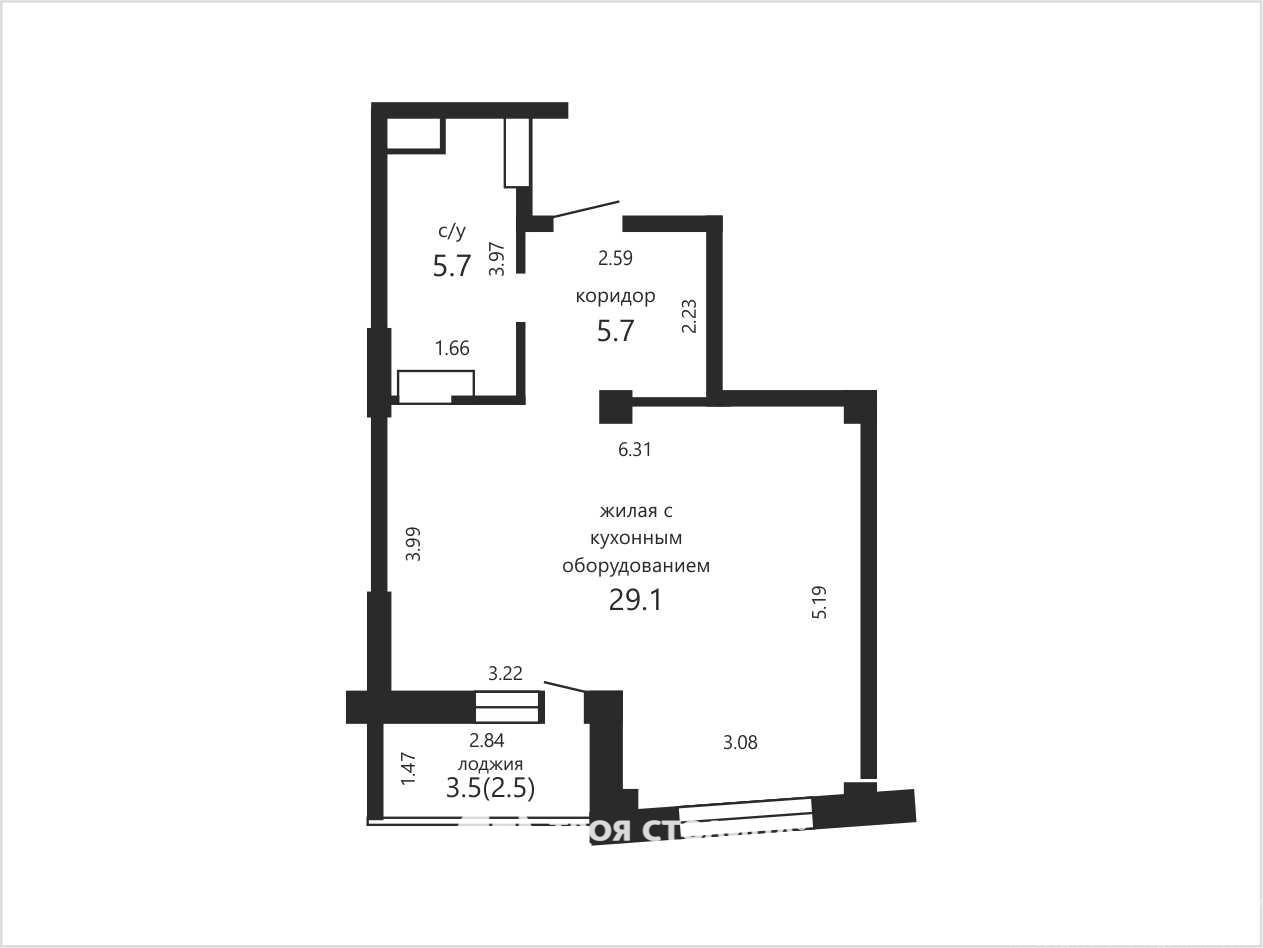 Общая площадь - 40,5 м² (по СНБ - 43,3 м²).