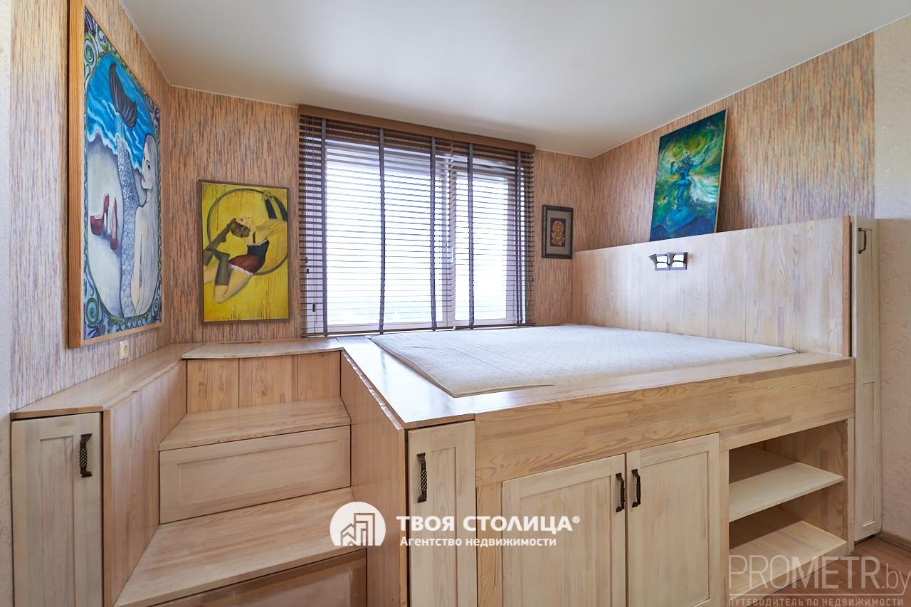 В жилой комнате установлен подиум со спальным местом (160*200), комфортным матрасом, деревянные жалюзи, диван, комод, полочки, оборудованы скрытые места хранения, в том числе два вместительных шкафа-купе, один выполнен с применением витражной техники.