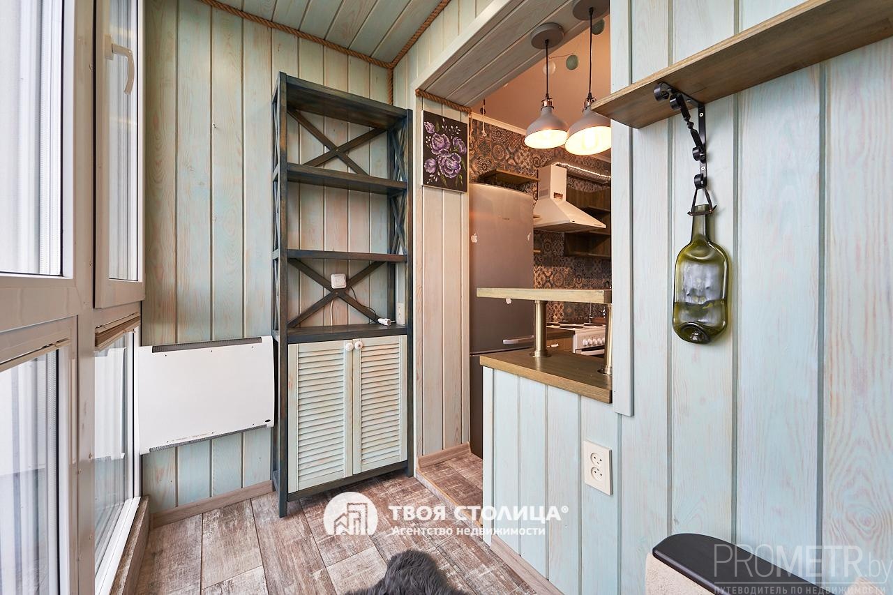 На лоджии: окно заменено на термостойкое, сохраняющее тепло, установлен конвекторный, экономичный обогреватель, потребление 0,36 киловатт, раскладное кресло, как дополнительное спальное место, полочки для хранения.