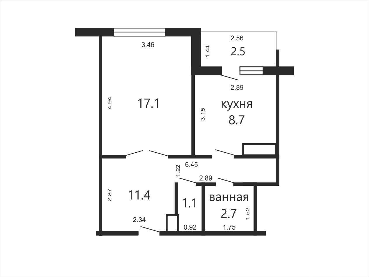 Общая площадь — 41 м² (43.5 м² по СНБ ), жилая — 17,1 м², кухня — 8,7 м².