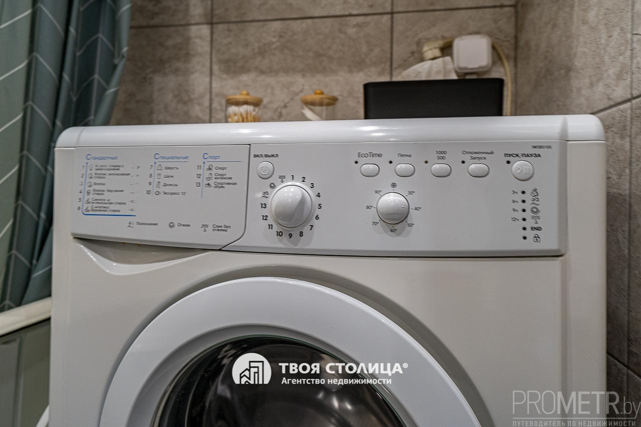 В санузле плитка актуального дизайна, установлена стиральная машина.