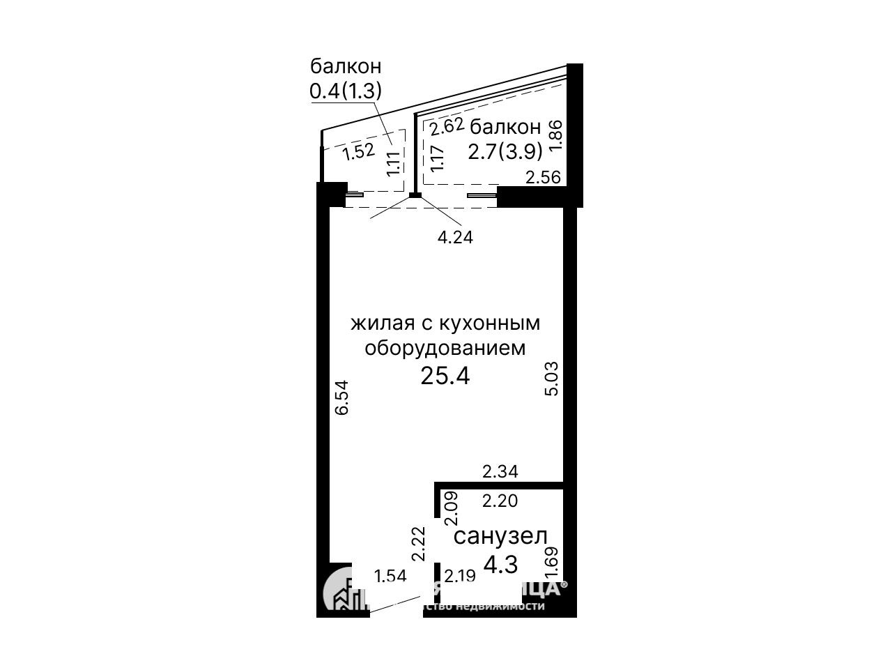 Площадь квартиры по СНБ 32.8, общая 29.7, жилая 25.4. Высота потолка 2.73