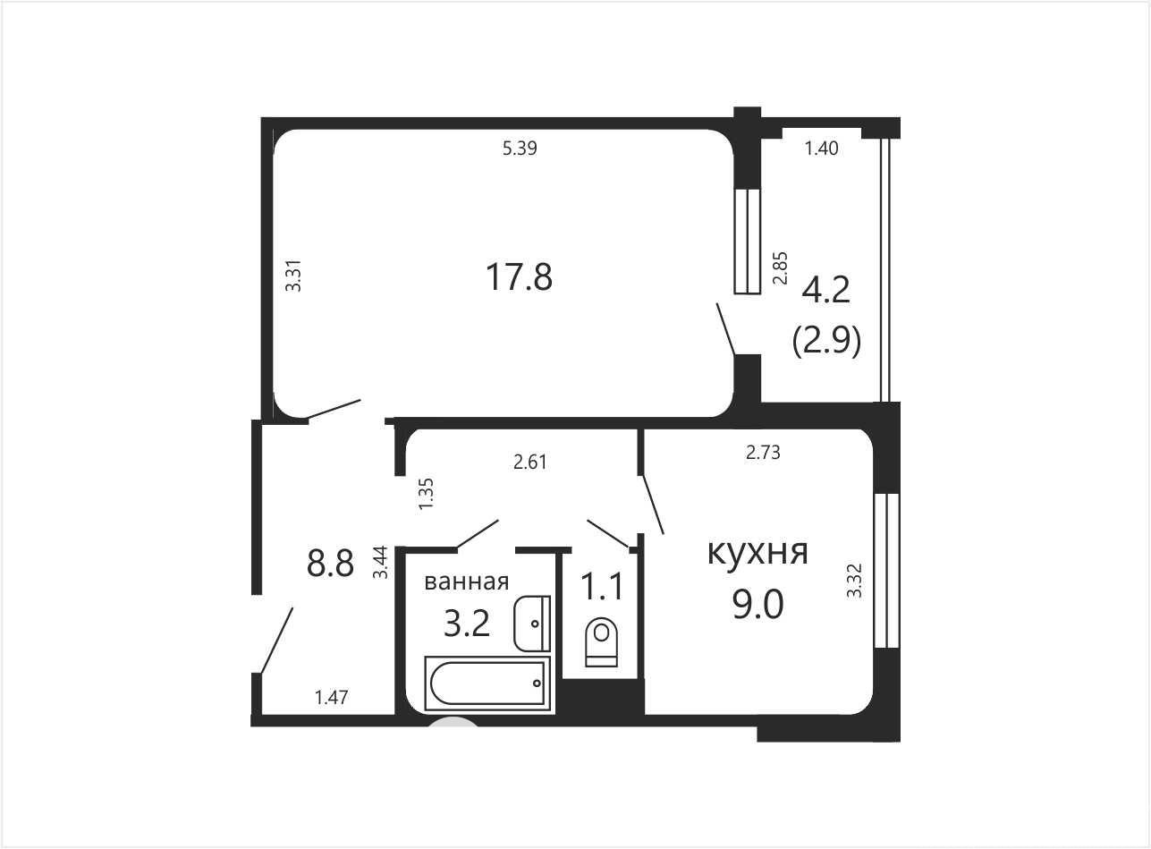 Общая площадь по СНБ - 42,8 м², что выгодно отличает объект от типовых однокомнатных квартир. Кухня 9 м² - правильной формы.