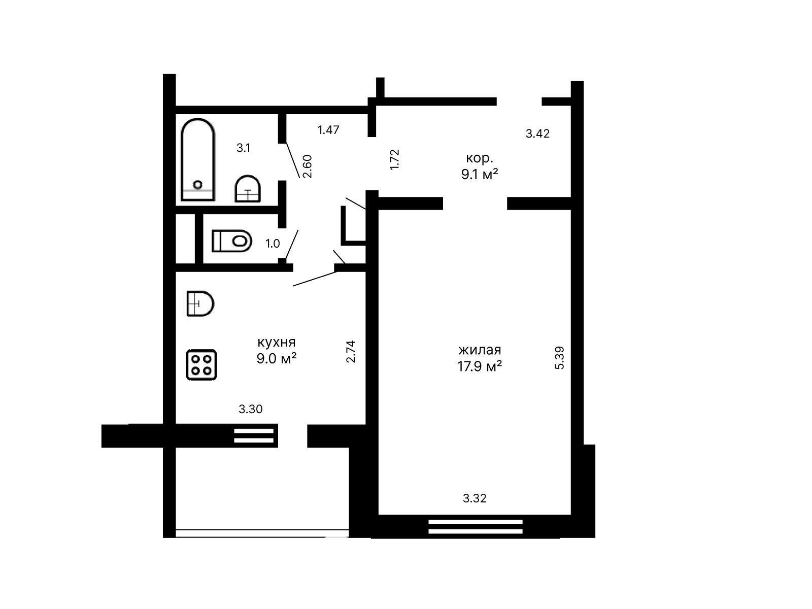 Общая площадь квартиры составляет 40.6 кв.м, жилая площадь – 17.9 кв.м, просторная кухня – 9 кв.м, что позволит с комфортом разместиться одному или двум жильцам. Квартира расположена на 2 этаже из 9-ти. Дом 1997 года постройки.
