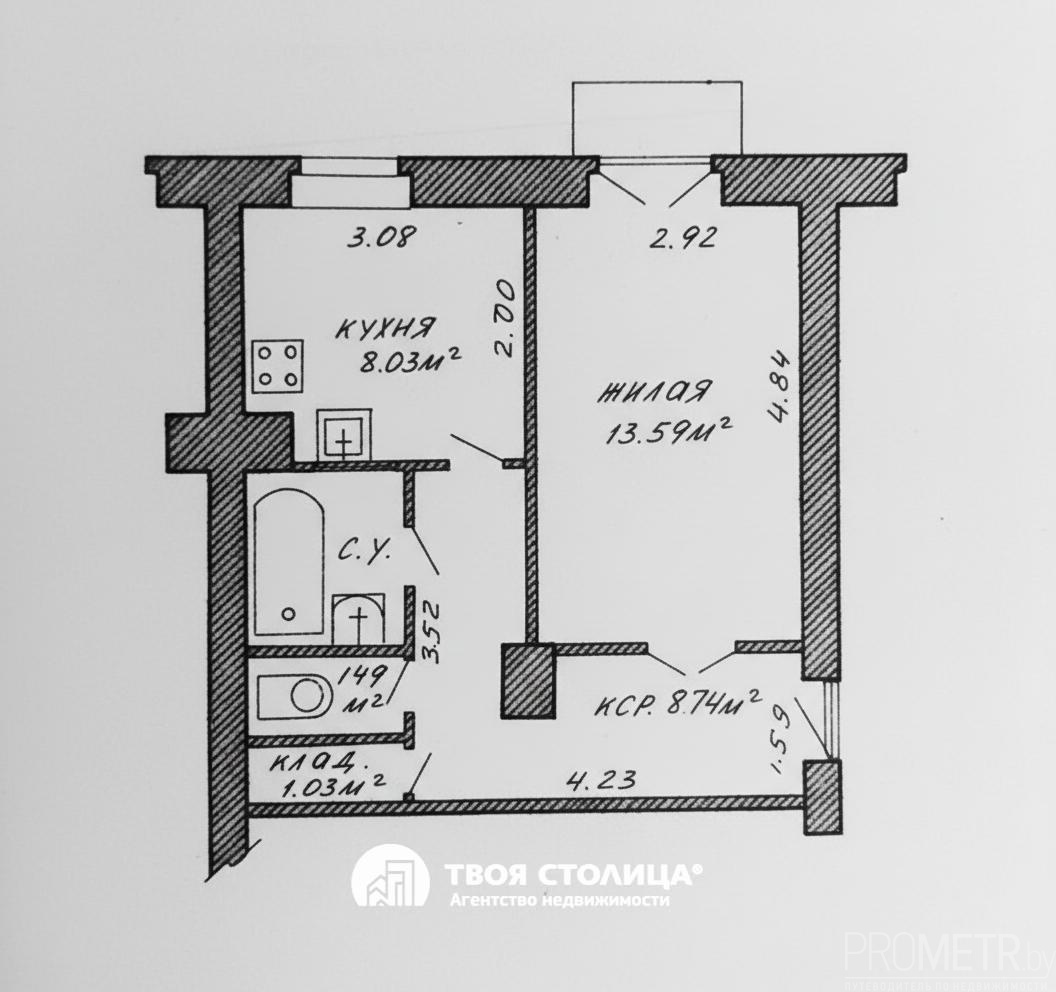 Общая площадь квартиры составляет 35.88 кв.м, жилая – 13.59 кв.м, просторная кухня – 8.03 кв.м. Высота потолков 3 метра создает ощущение простора. Квартира полностью в аккуратном жилом состоянии, выполнен хороший ремонт, что позволяет сразу заехать и жить .Окна выходят на южную сторону, во двор, обеспечивая много света и тишину. Санузел раздельный, есть балкон. Установлены металлическая дверь, стеклопакеты, счетчики воды и домофон.