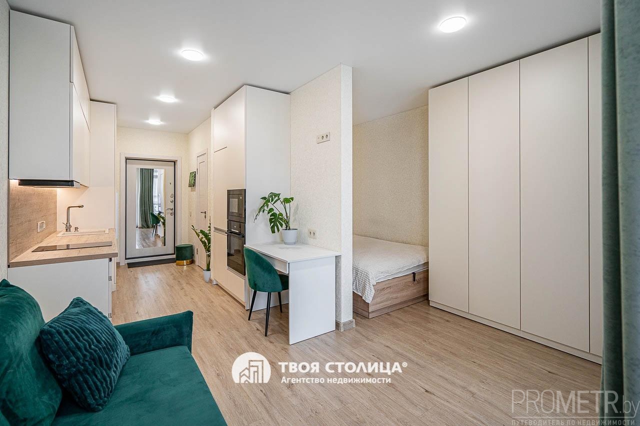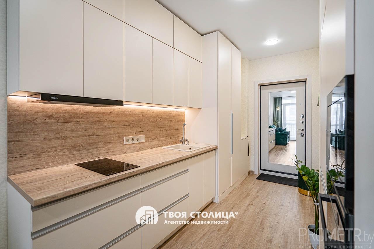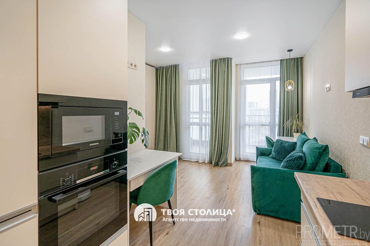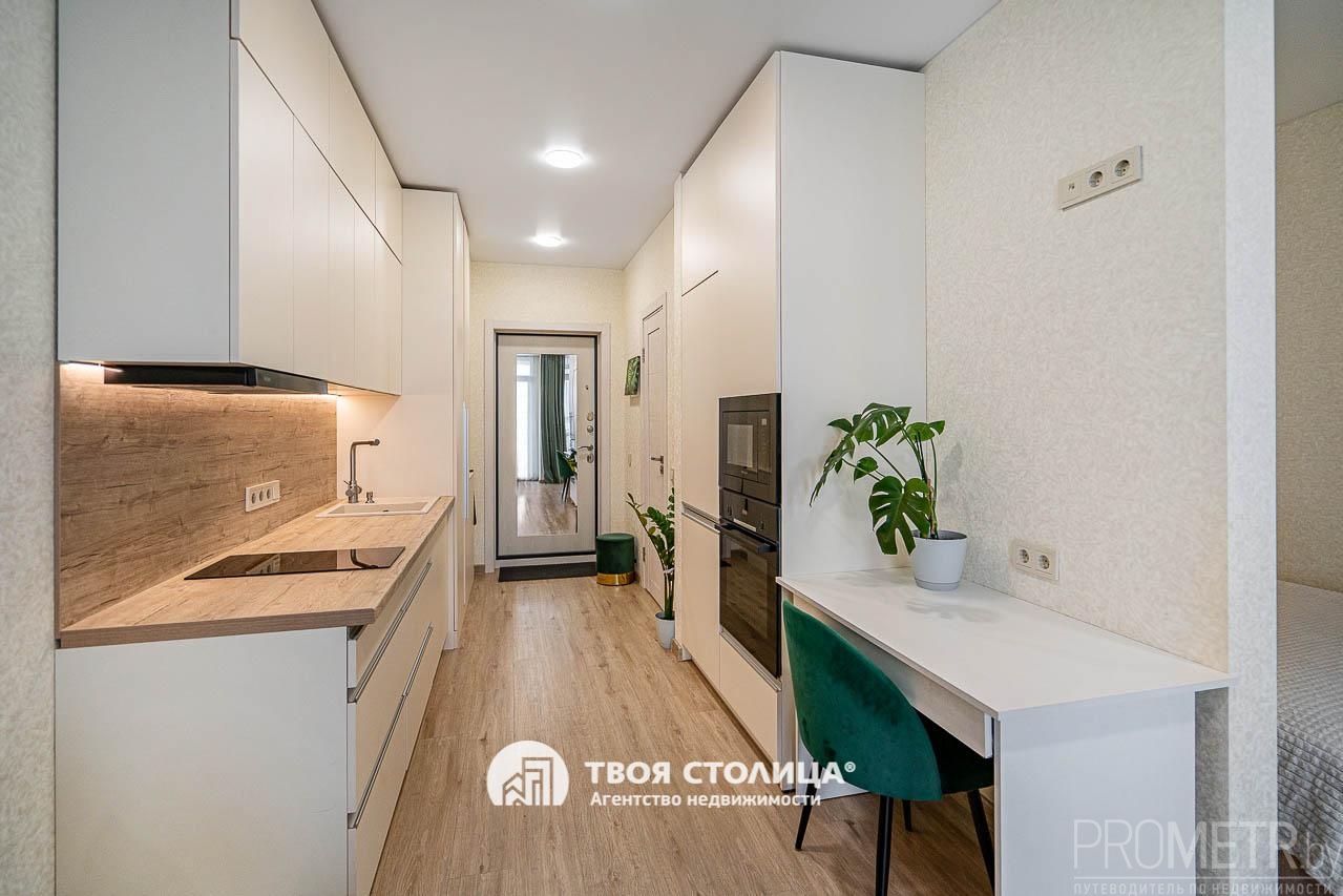 Пол- кварцвинил. Стены - обои. Натяжные потолки. Высота помещений- 2.72 м. Проходные светильники, много сценариев освещения. Современная плитка в санузле, импортная сантехника, тропический душ. Встроенная кухня с бытовой техникой (варочная индукционная панель, духовой шкаф, вытяжка, холодильник, микроволновка), установлен фильтр для воды. Встроенный вместительный шкаф в комнате, шкаф и обувница в коридоре, диван, стол, стулья. Выделена зона спальни, кровать с подъемным механизмом. Качественная входная металлическая дверь с большим зеркалом.