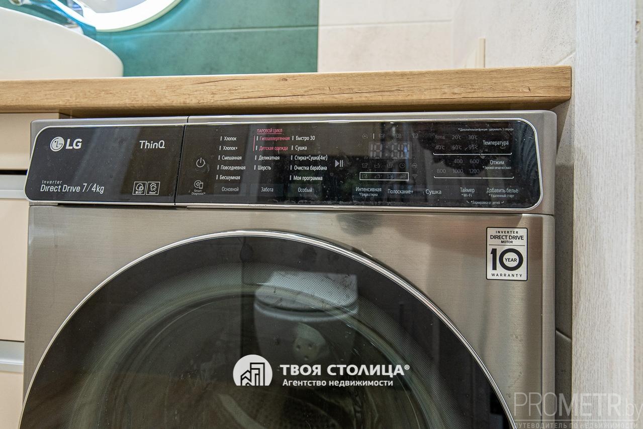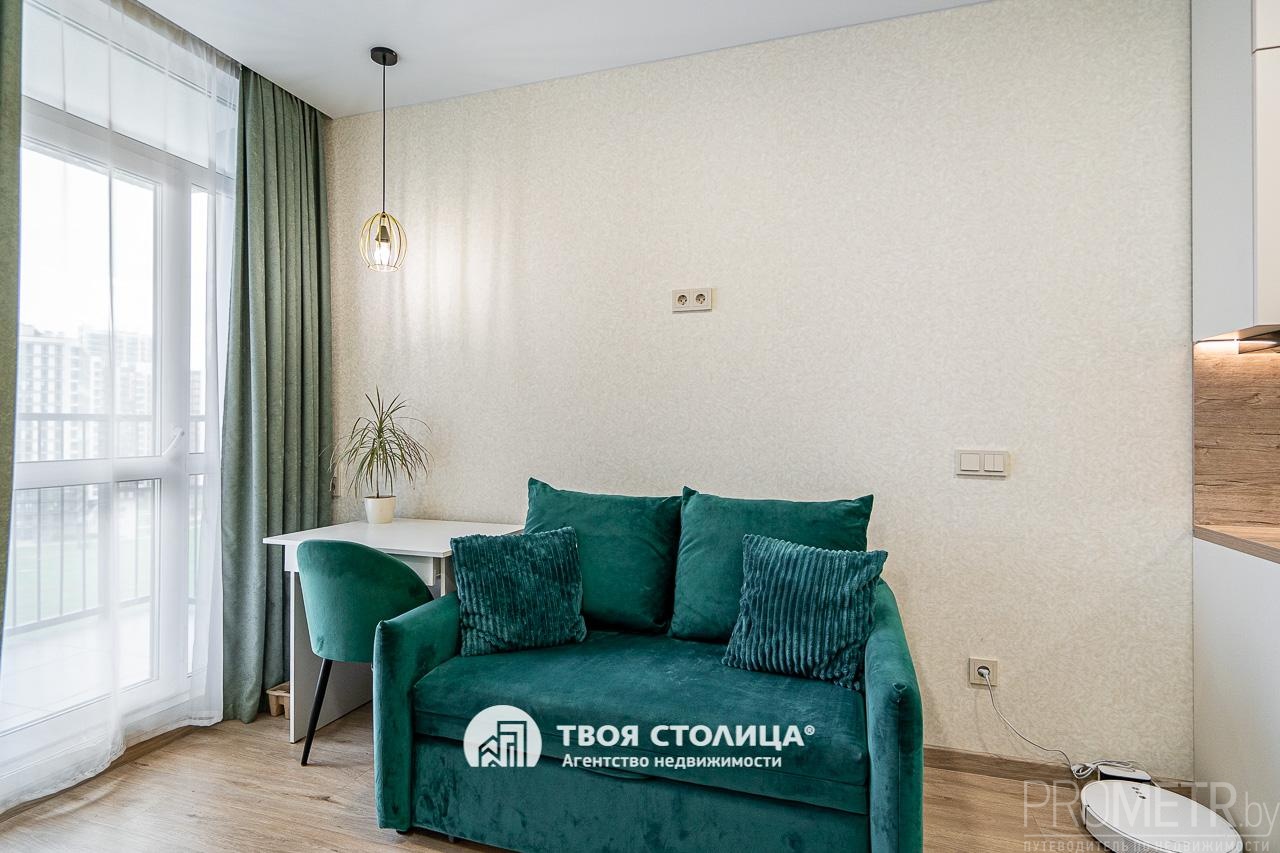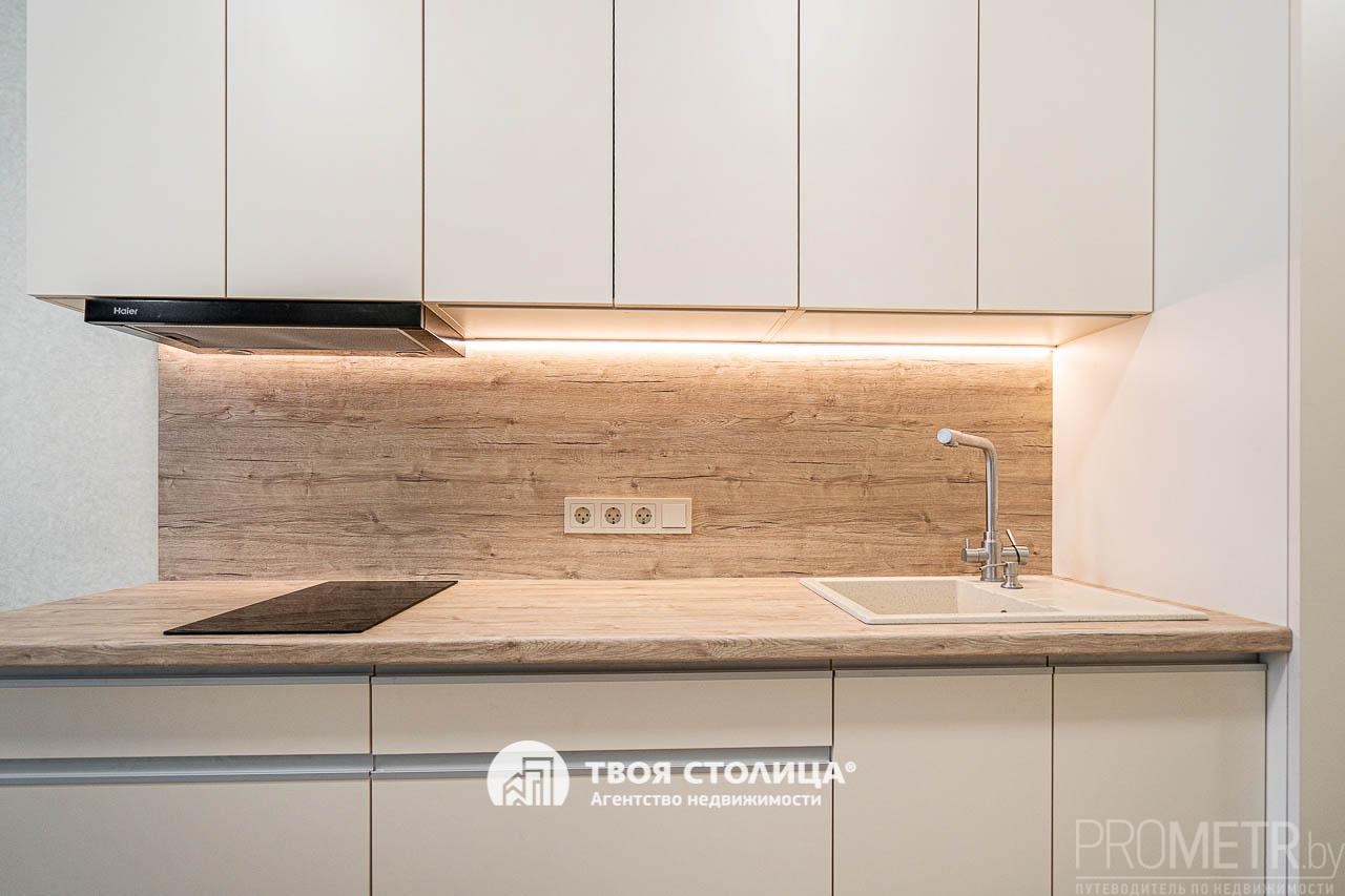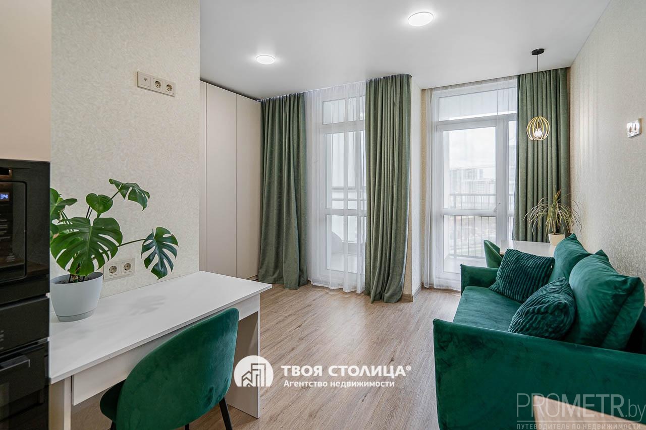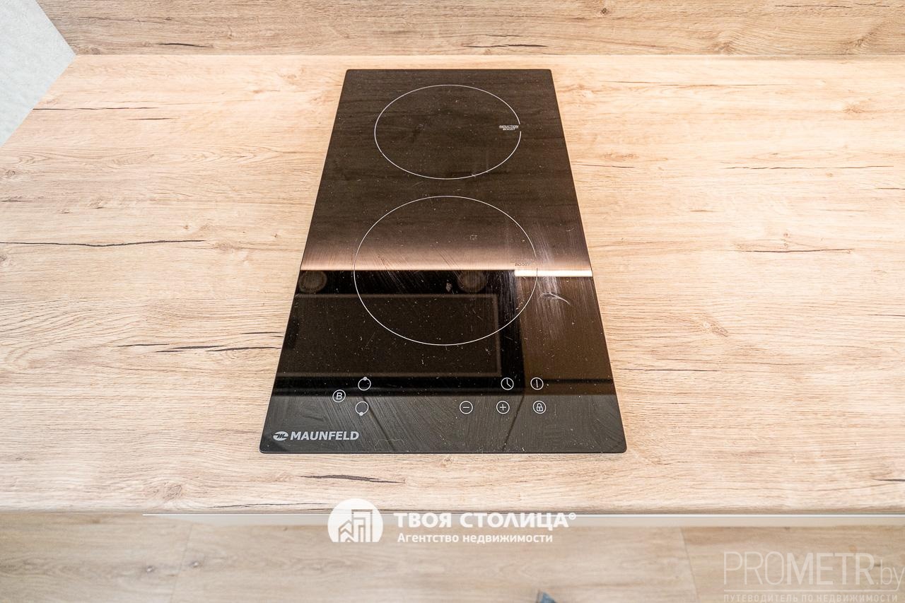 Пол- кварцвинил. Стены - обои. Натяжные потолки. Высота помещений- 2.72 м. Проходные светильники, много сценариев освещения. Современная плитка в санузле, импортная сантехника, тропический душ. Встроенная кухня с бытовой техникой (варочная индукционная панель, духовой шкаф, вытяжка, холодильник, микроволновка), установлен фильтр для воды. Встроенный вместительный шкаф в комнате, шкаф и обувница в коридоре, диван, стол, стулья. Выделена зона спальни, кровать с подъемным механизмом. Качественная входная металлическая дверь с большим зеркалом.
