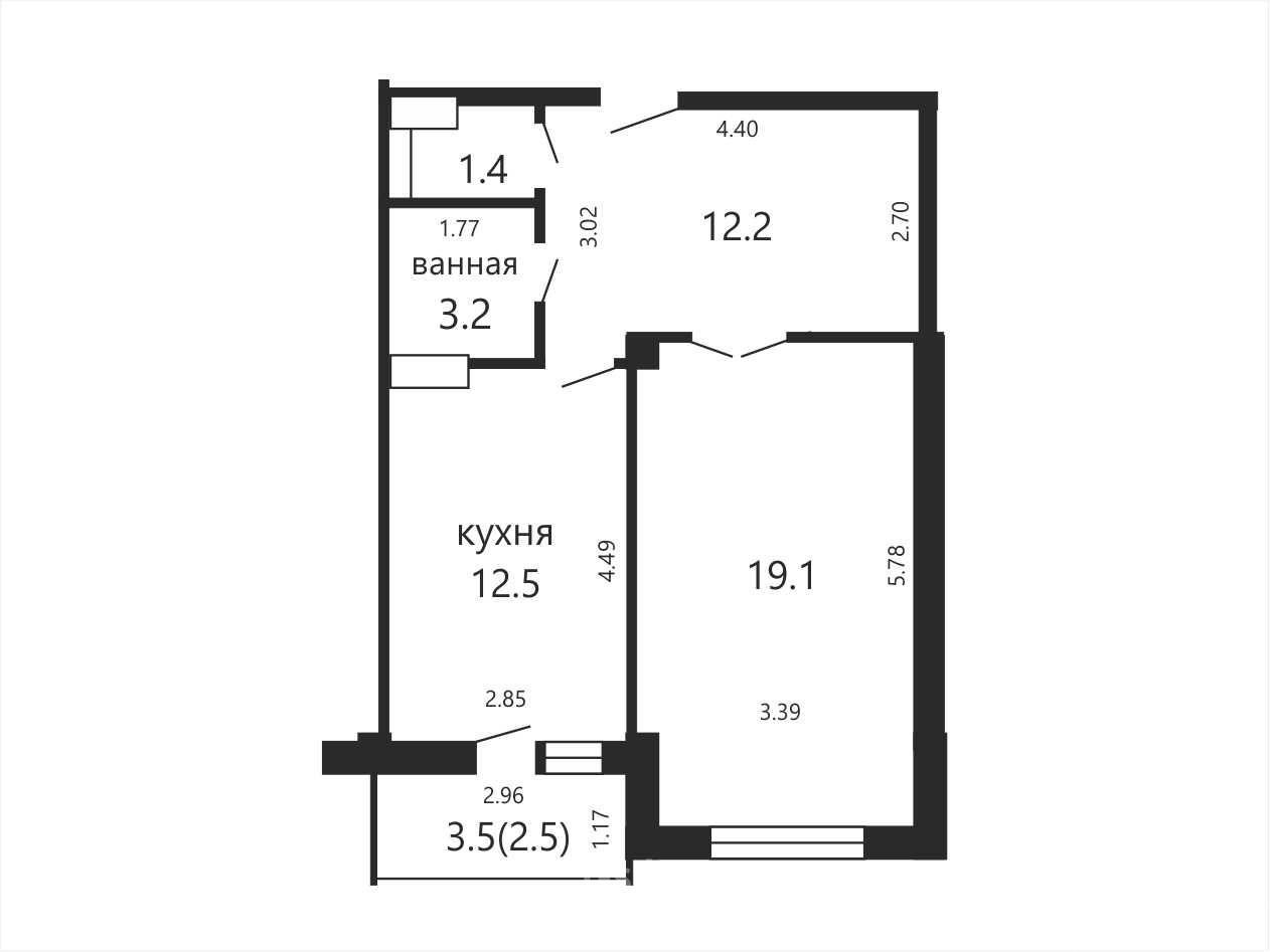 Общая площадь: 48.4. Жилая площадь: 19.1. Площадь кухни: 12.5. Высота потолка: 2.74.