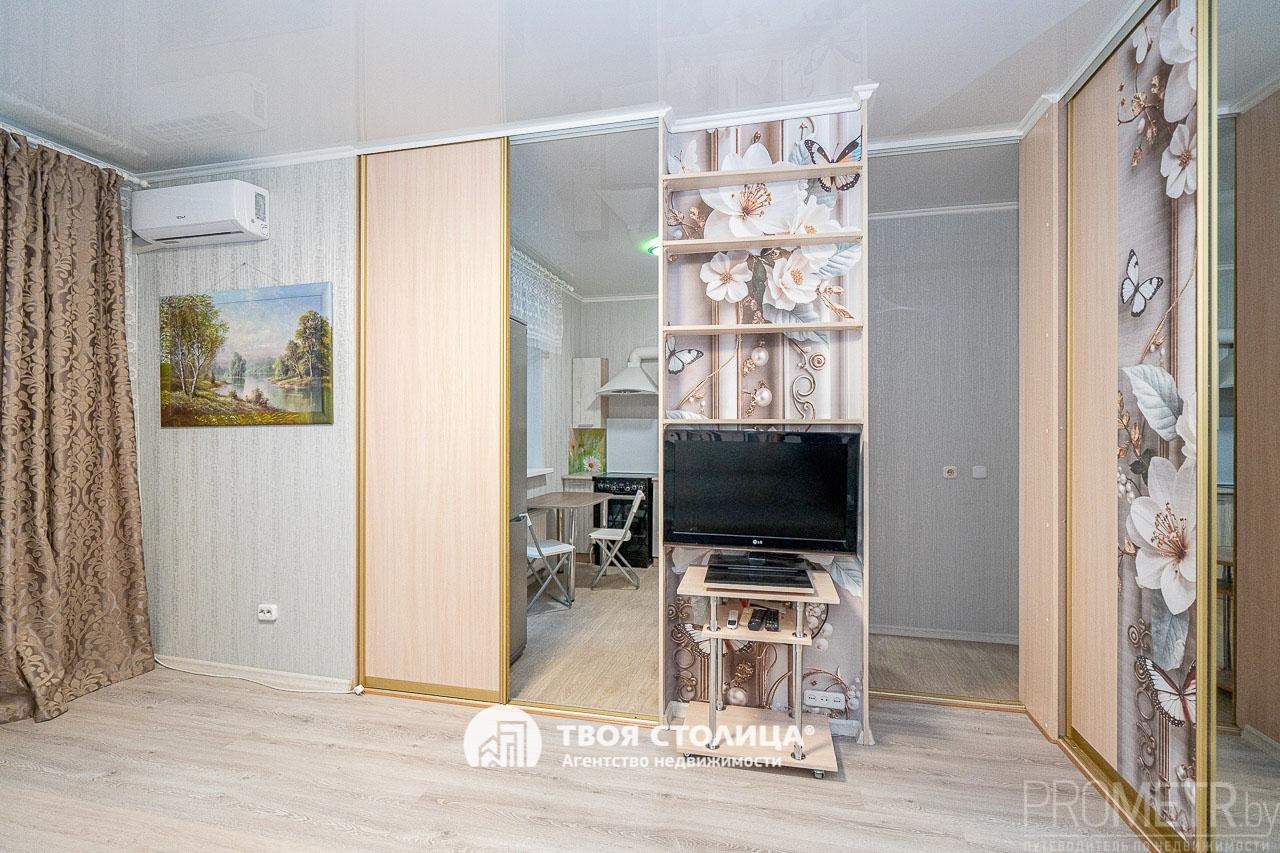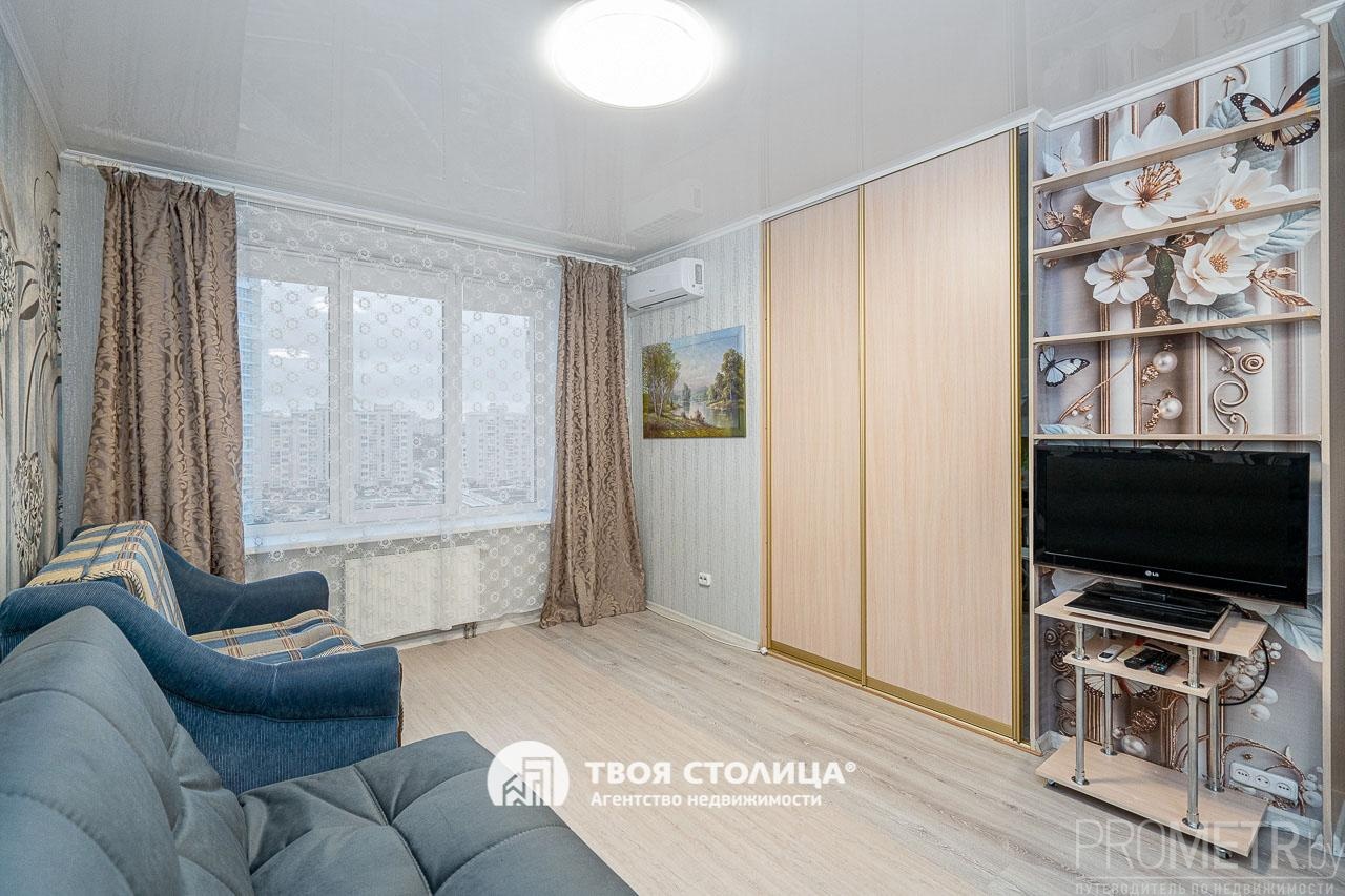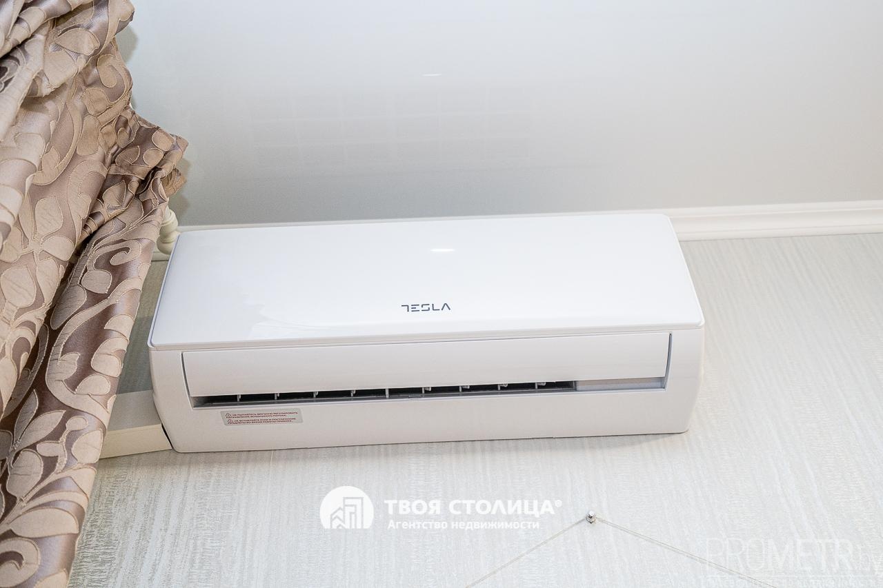 Квартира готова к проживанию. В окнах установлены стеклопакеты, в т.ч. остекление лоджии, установлены рольшторы. Напольное покрытие - линолеум, ламинат в жилой комнате и плитка в санузле. Микроклимат в квартире регулируется кондиционером. Кухня с электроплитой и вытяжкой. Санузел облицован плиткой, установлена необходимая сантехническая посуда. Оборудованы места хранения: вместительный встроенный шкаф-купе. Современные радиаторы отопления, приборы учета воды, домофон, оптоволоконная связь. Металлическая входная дверь.