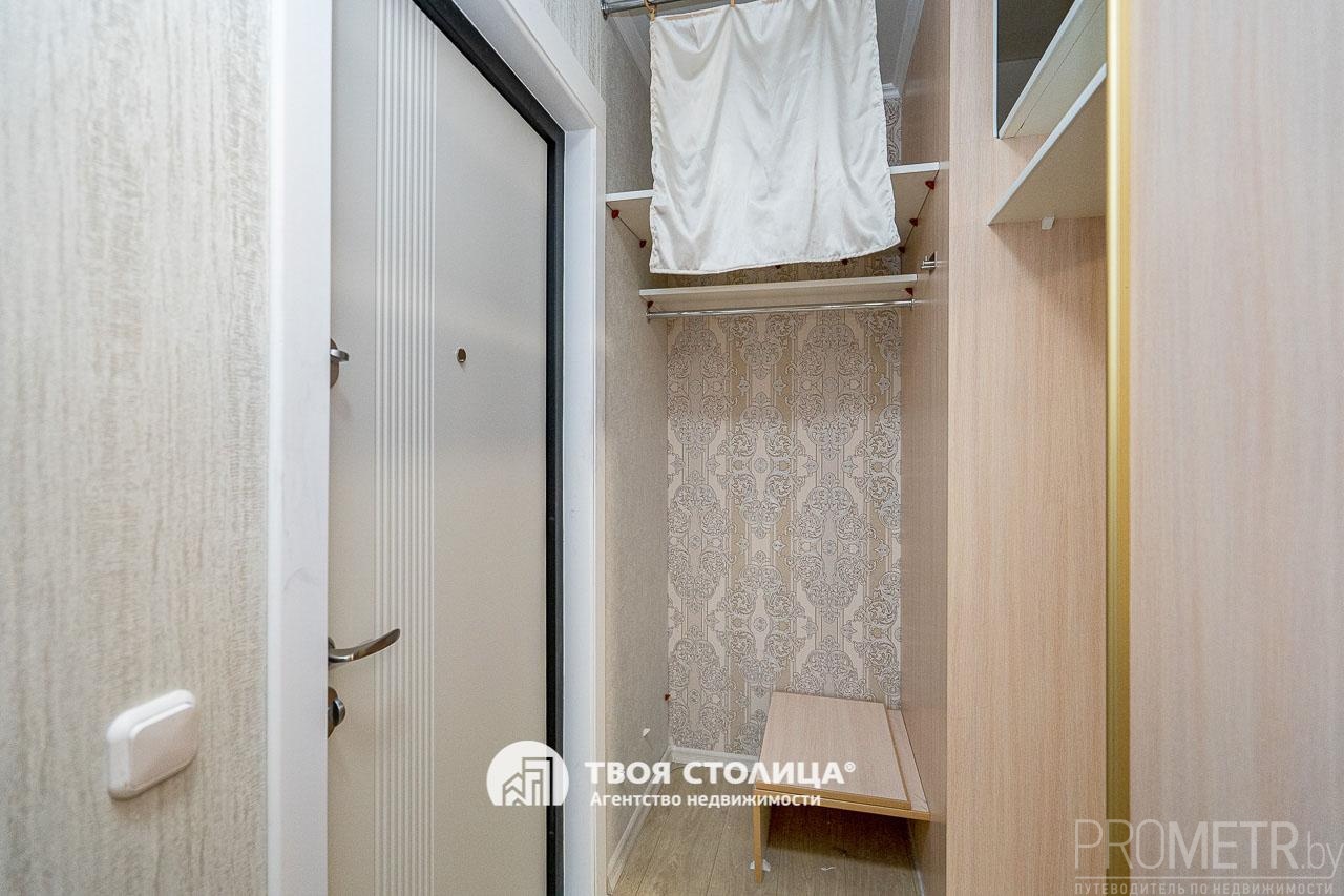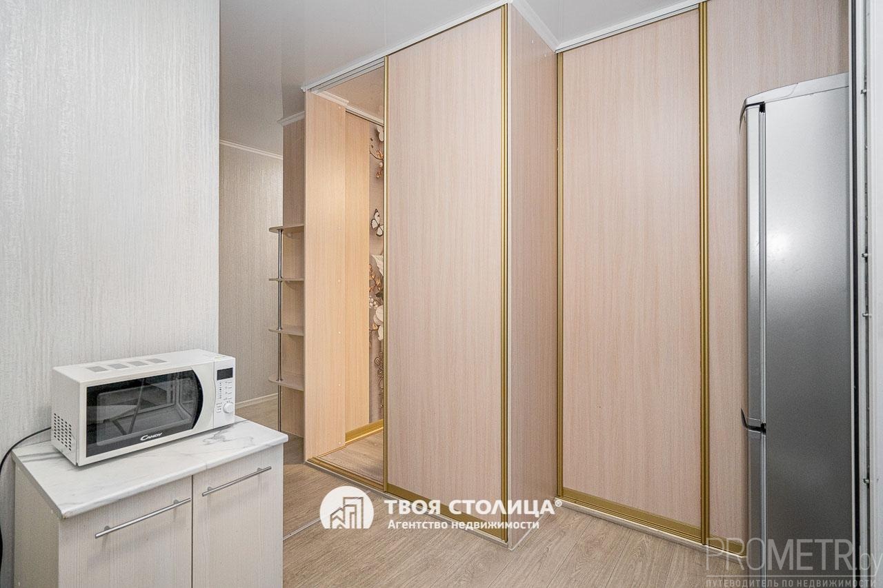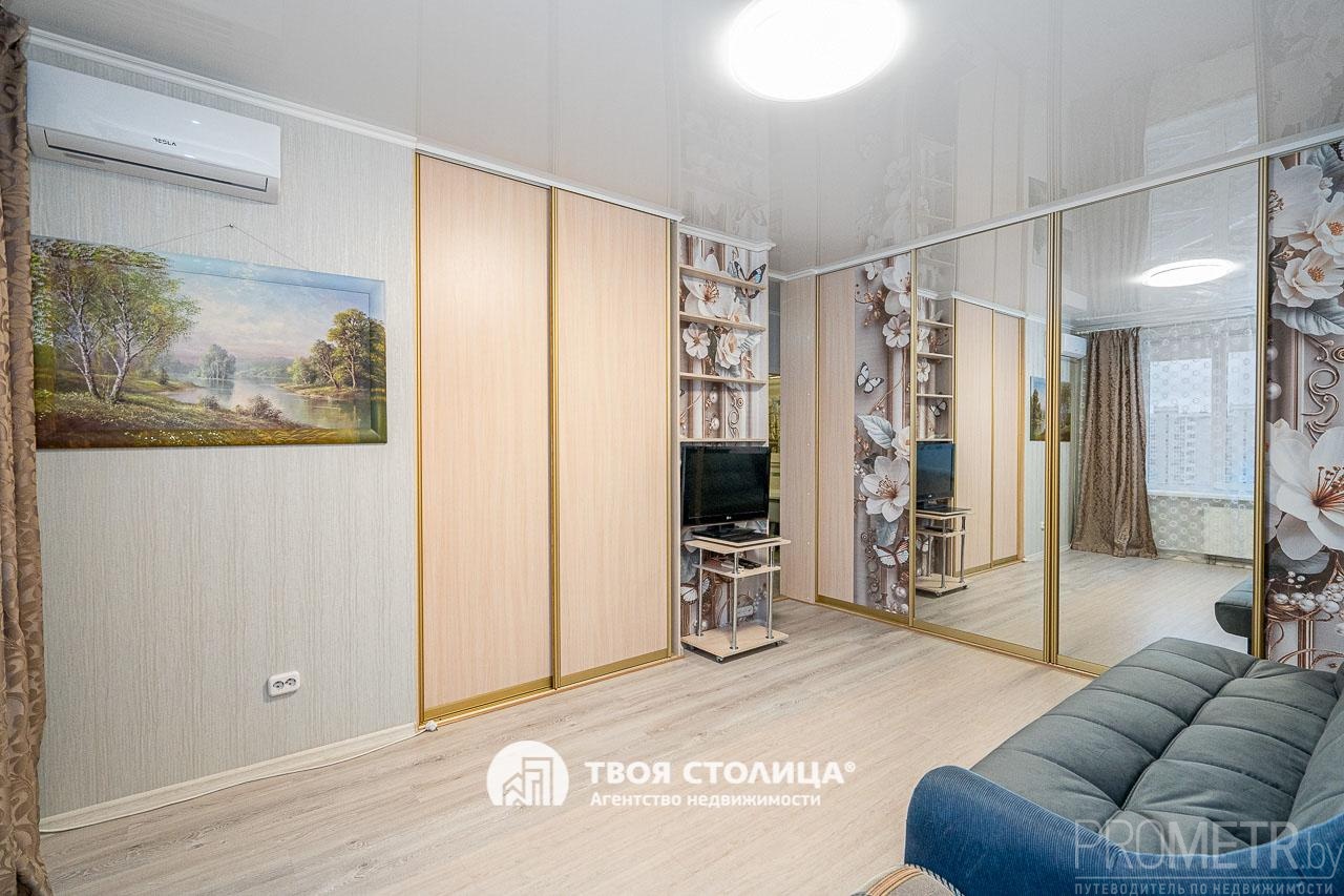 Квартира готова к проживанию. В окнах установлены стеклопакеты, в т.ч. остекление лоджии, установлены рольшторы. Напольное покрытие - линолеум, ламинат в жилой комнате и плитка в санузле. Микроклимат в квартире регулируется кондиционером. Кухня с электроплитой и вытяжкой. Санузел облицован плиткой, установлена необходимая сантехническая посуда. Оборудованы места хранения: вместительный встроенный шкаф-купе. Современные радиаторы отопления, приборы учета воды, домофон, оптоволоконная связь. Металлическая входная дверь.