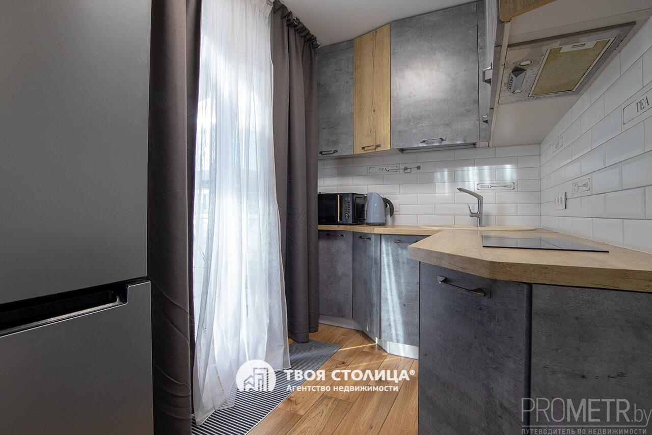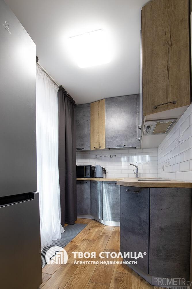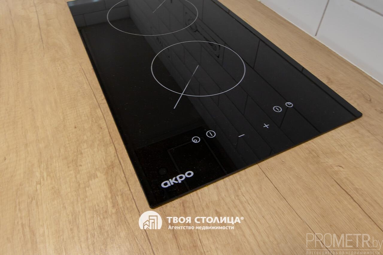 Кухонная зона укомплектована встроенной мебелью и бытовой техникой.
