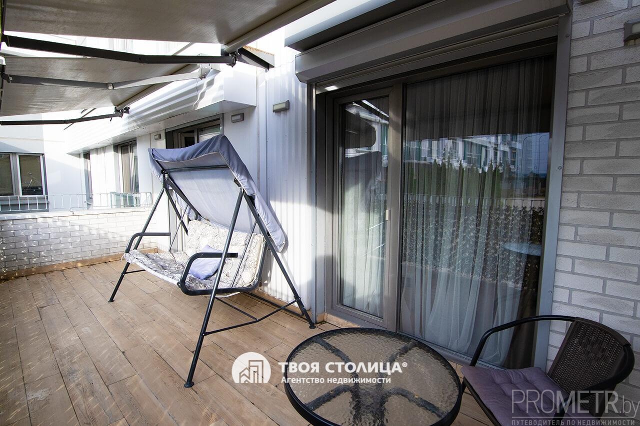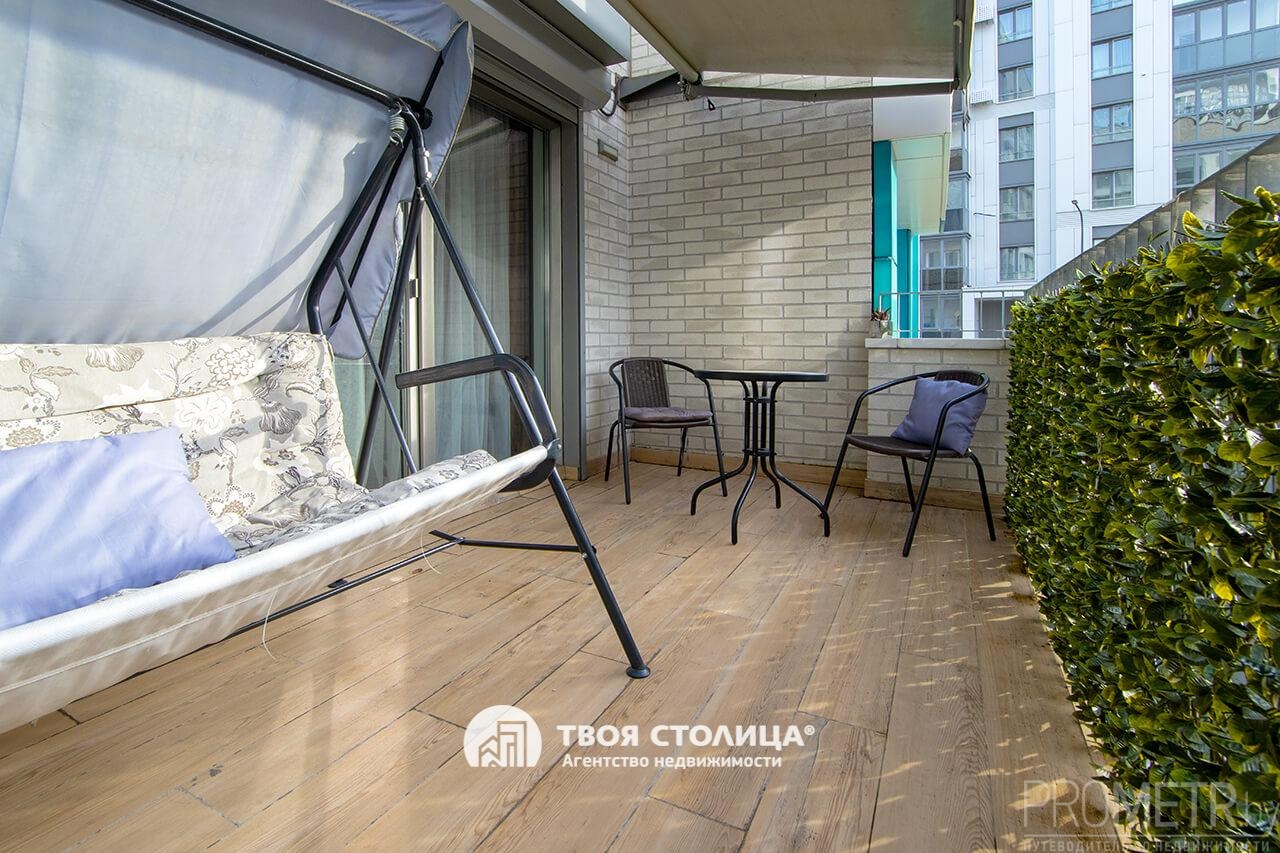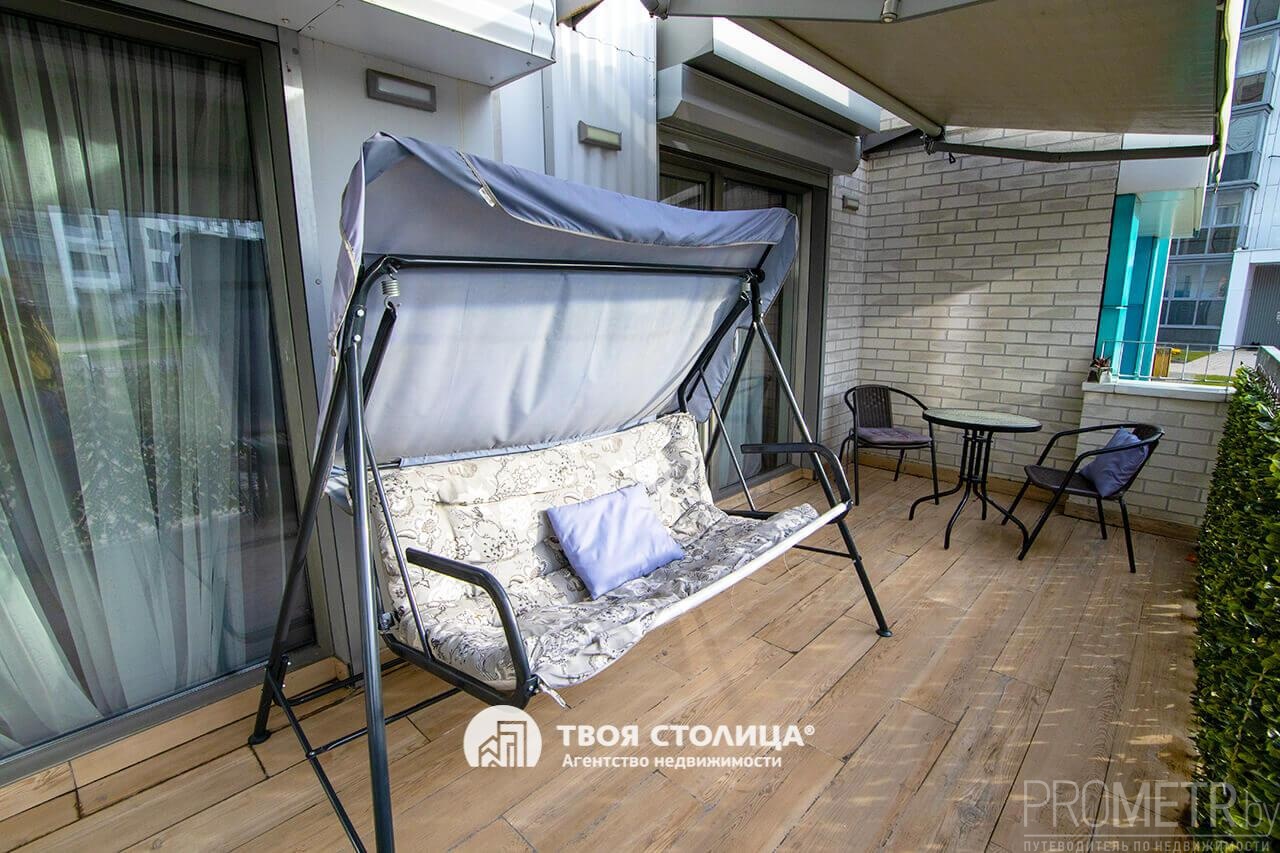 Терраса фактической площадью15 м2, обустроена стильной мебелью, уютными качелями, декоративными элементами и оснащена солнце- и влагозащитными маркизами.
