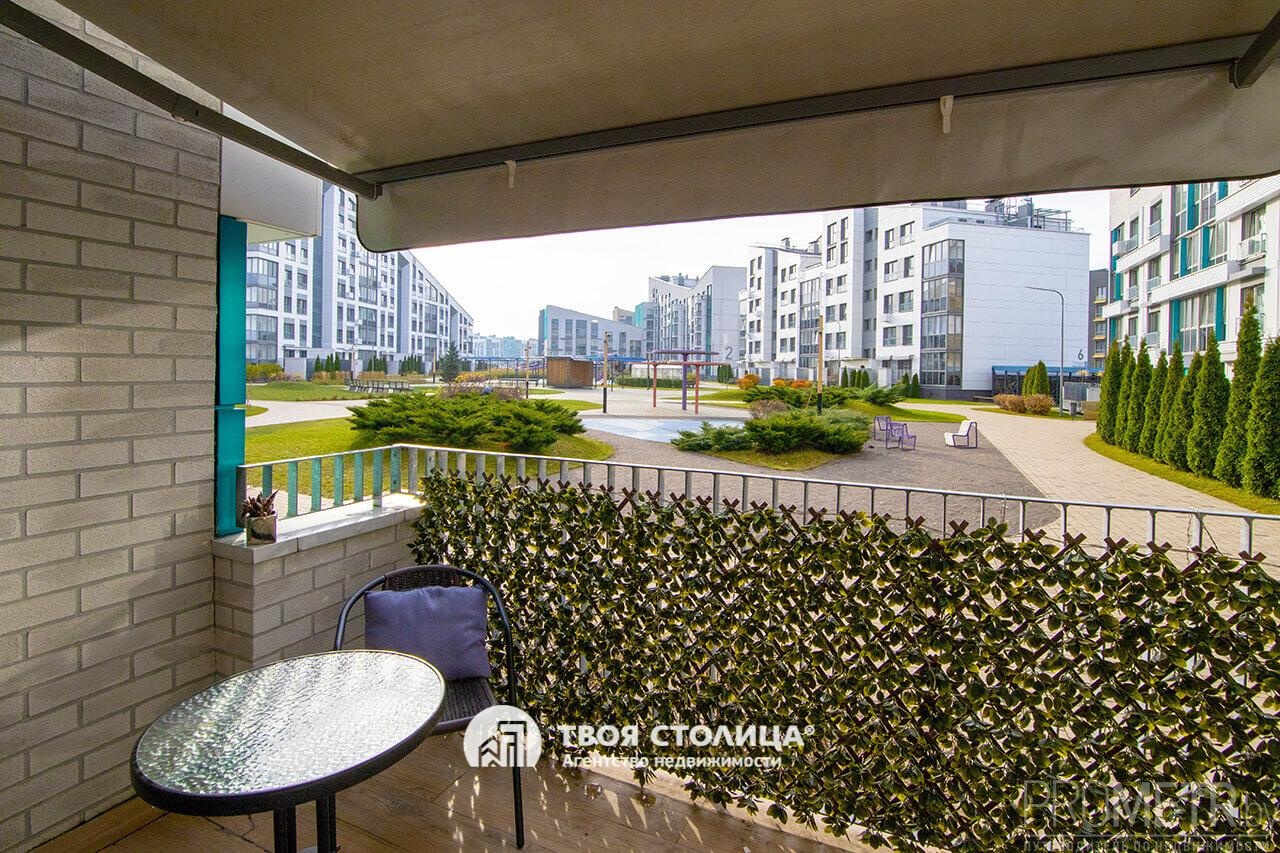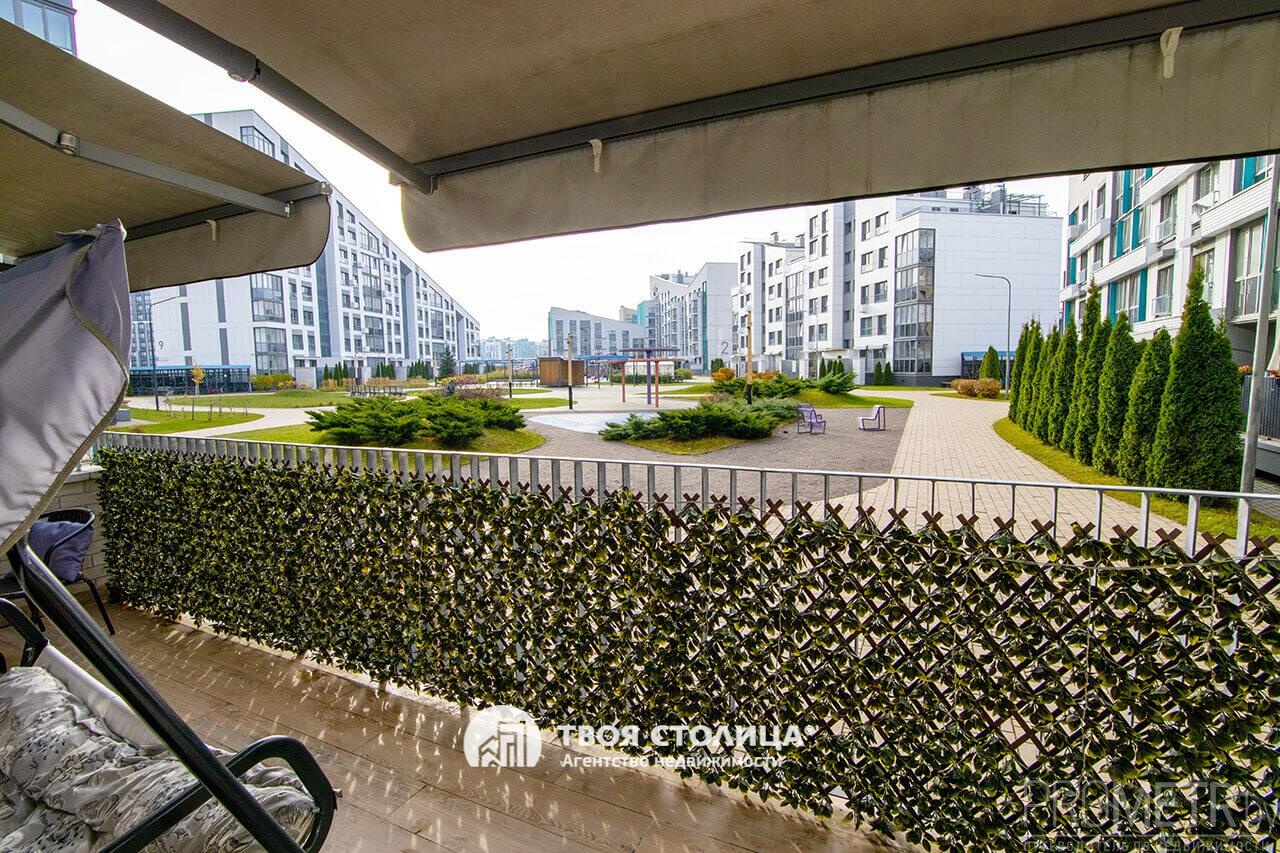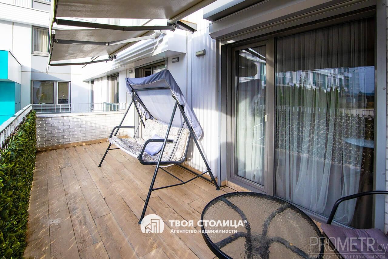 Терраса фактической площадью15 м2, обустроена стильной мебелью, уютными качелями, декоративными элементами и оснащена солнце- и влагозащитными маркизами.