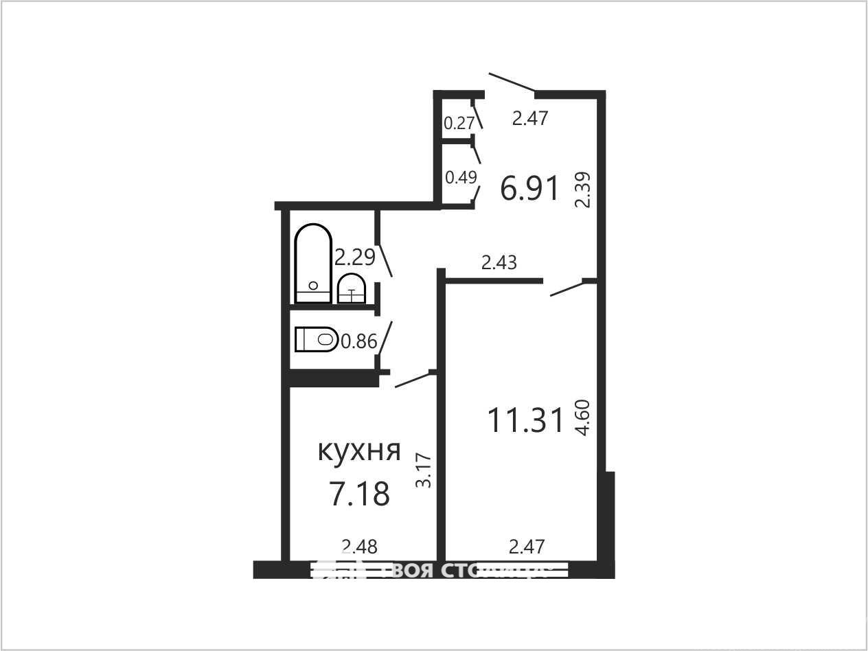 Санузел раздельный. В достаточно просторным коридоре (6. 91 кв.м) встроенные шкафы.