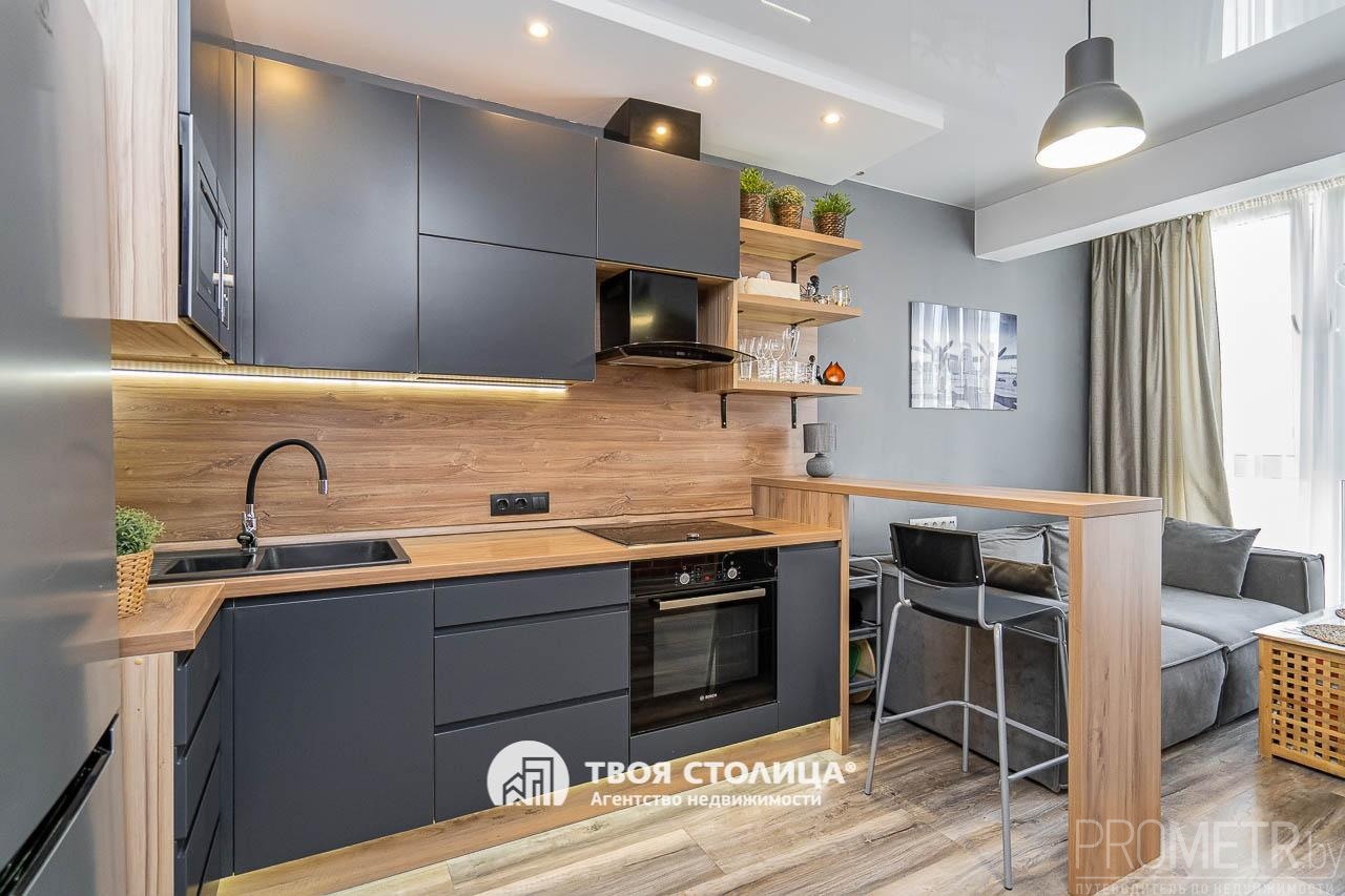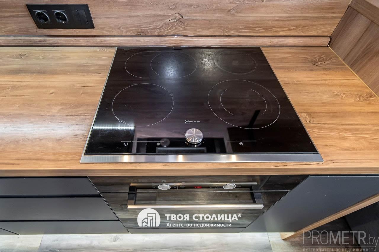 Кухонная зона укомплектована встроенной мебелью и бытовой техникой от ведущих европейских производителей.