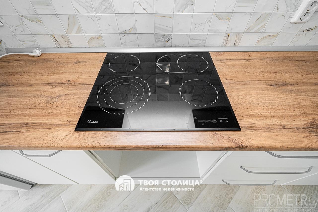 Кухня – это сочетание стиля и функциональности. Новейшие тенденции делают её гармоничной. Кухонная зона со встроенной мебелью укомплектована варочной поверхностью.