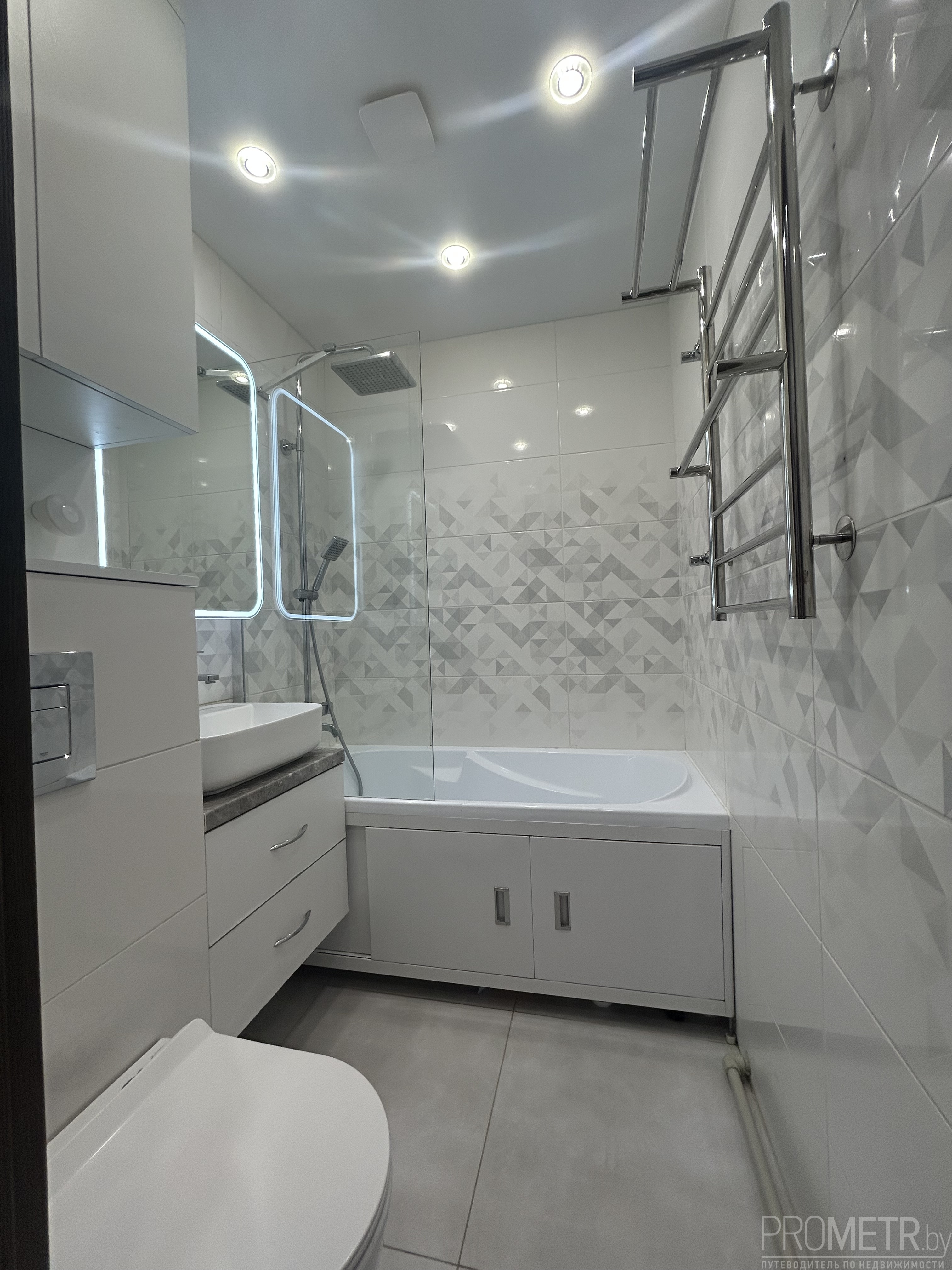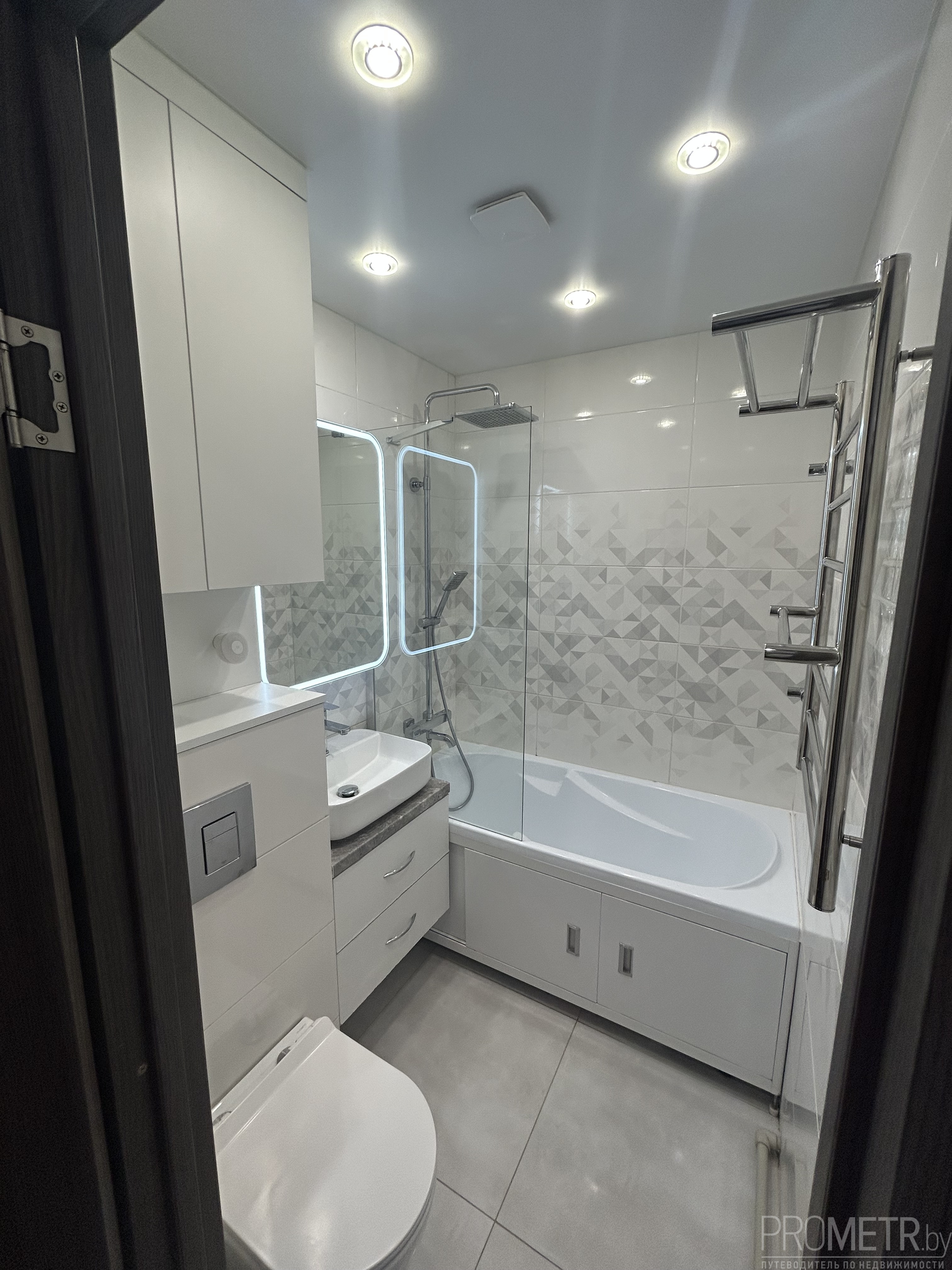 - Санузел- инсталляция , подвесной унитаз (Испания), счетчики , двухуровневое освещение и вытяжка, плитка-Италия, тропический душ