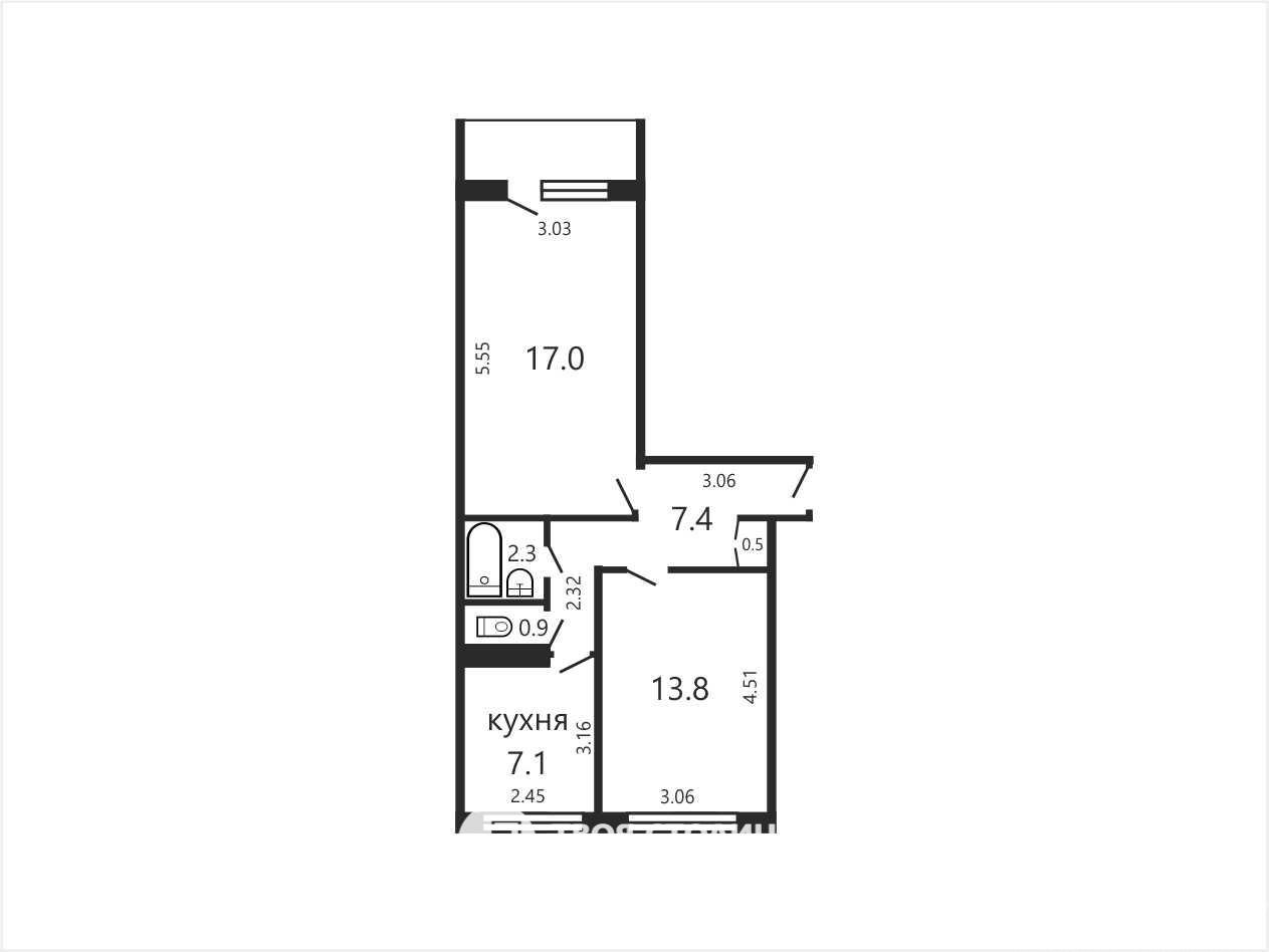 Две комфортные раздельные комнаты (17,0 кв.м и 13.8 кв.м.). Из комнаты выход на балкон, остекленный рамой.