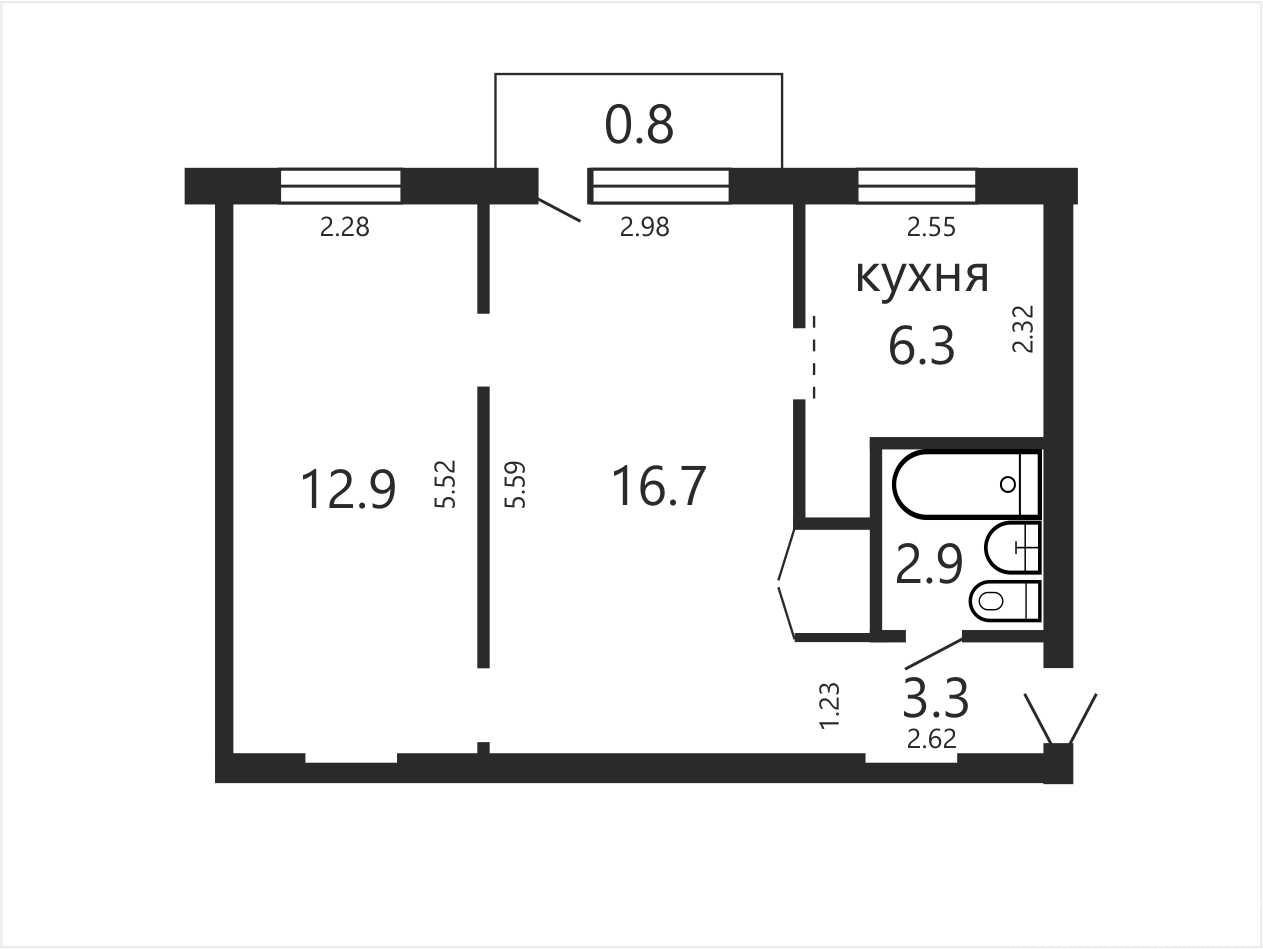 кухня – 6,3 м2, высота потолков — 2,5 м.