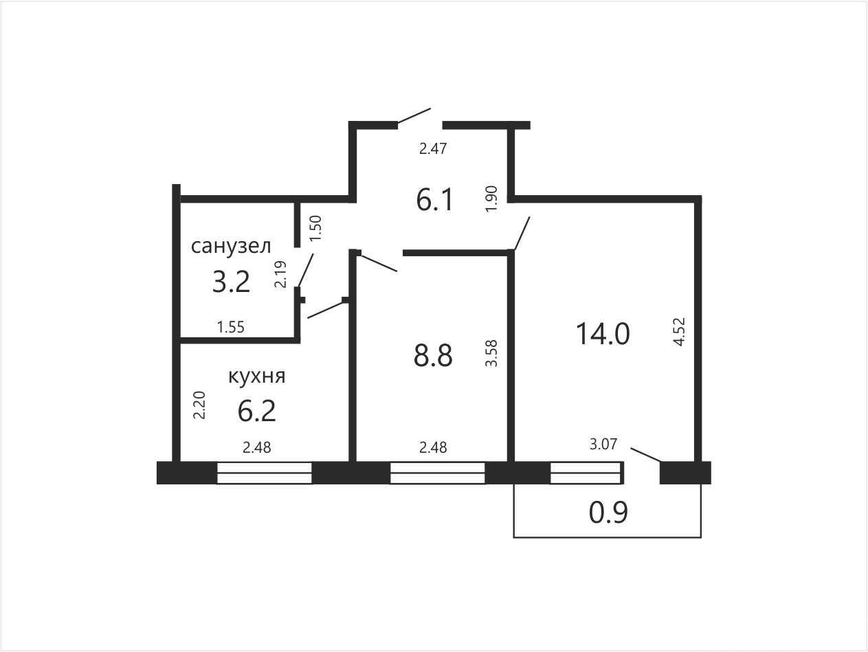 Две комфортные раздельные комнаты (14,0 кв.м и 8.8 кв.м.) — легко зонируются для отдыха, сна и работы, сделана звукоизоляция. Из комнаты выход на балкон, остекленный ПВХ рамой, проведен свет.
