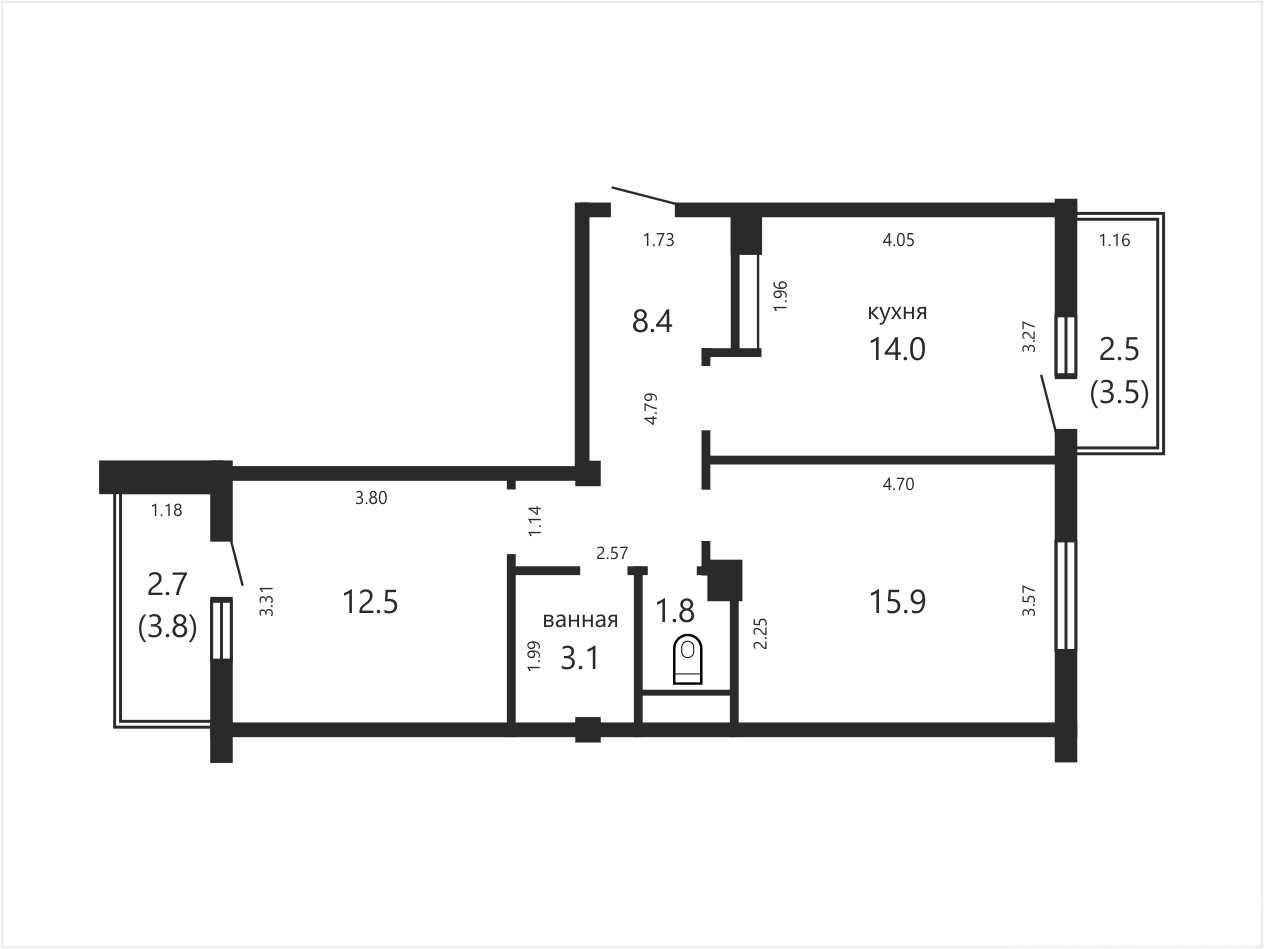 - Раздельные жилые комнаты — 12,5 м² и 15,9 м², светлые и функциональные