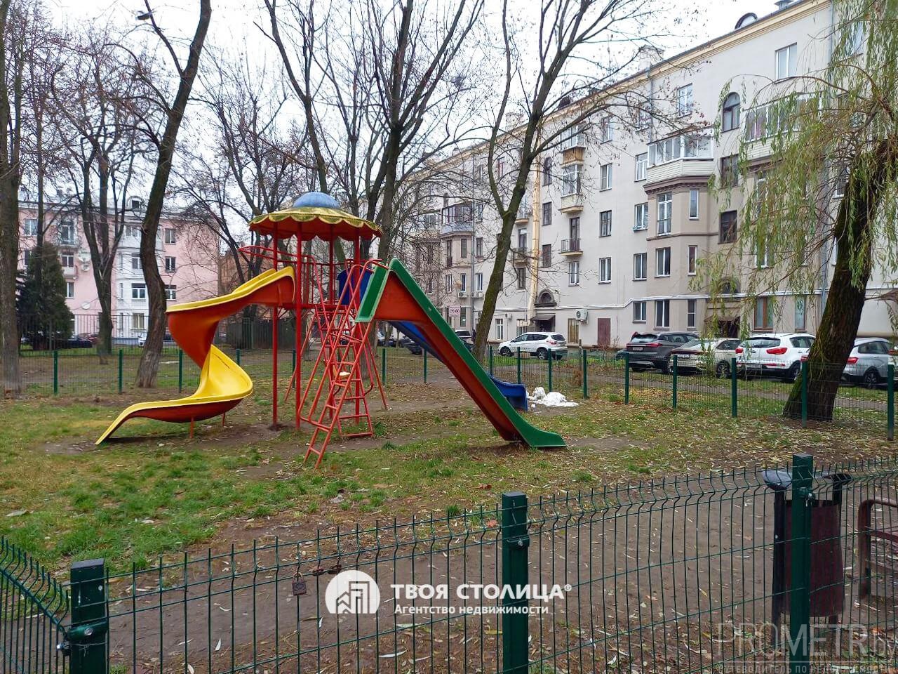Во дворе достаточно парковочных мест, установлены скамейки, есть детская площадка.