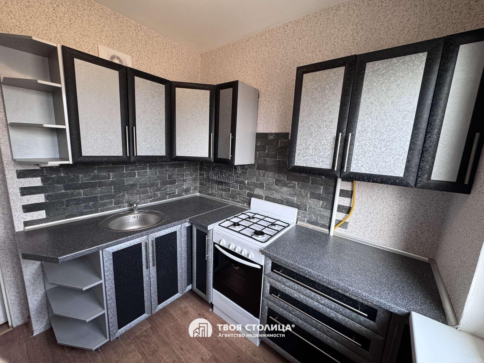 Встроенная кухня с газовой плитой и холодильником.