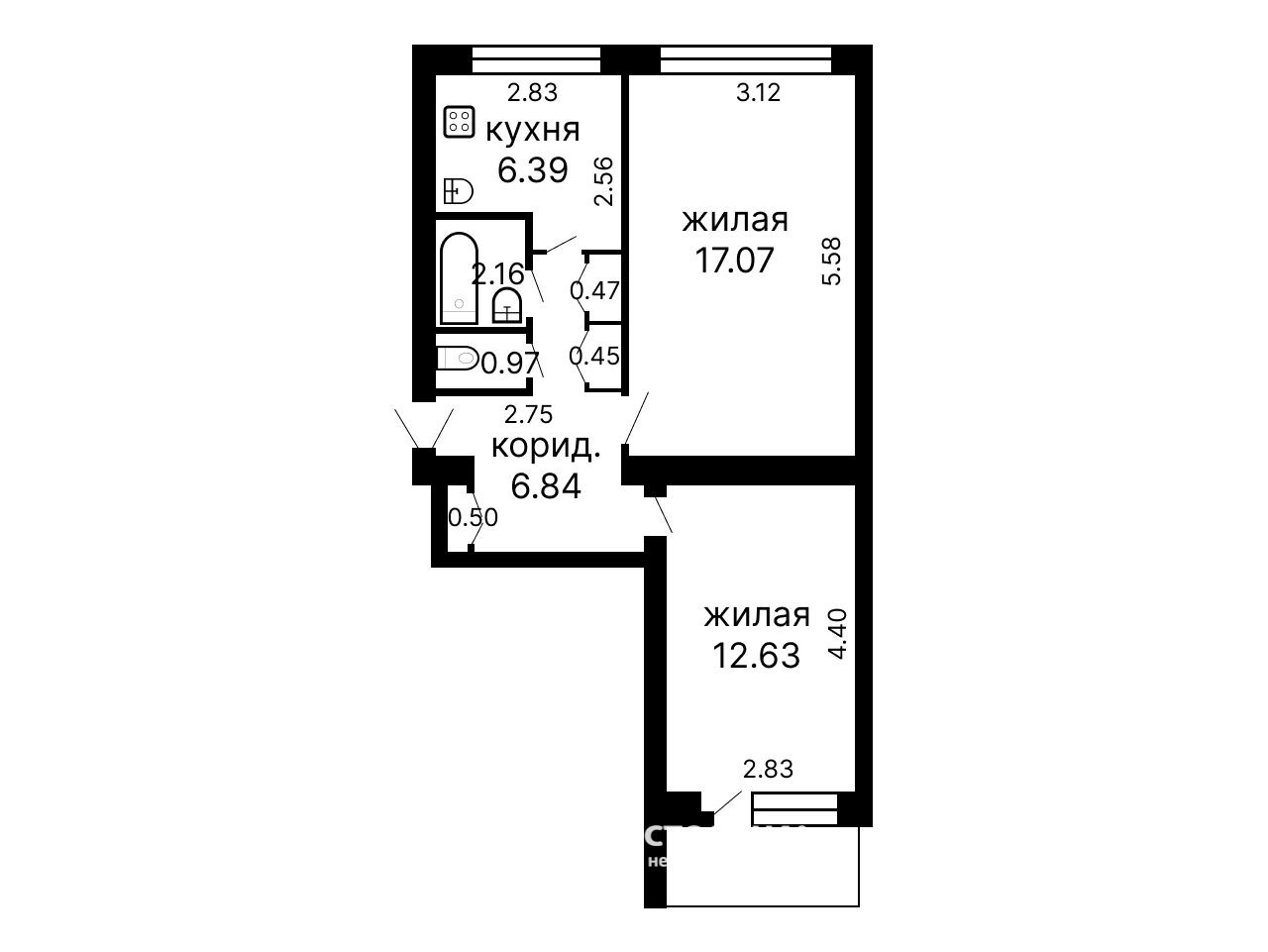 Две раздельные комнаты и раздельный санузел - практичное решение как для семьи, так и для аренды.