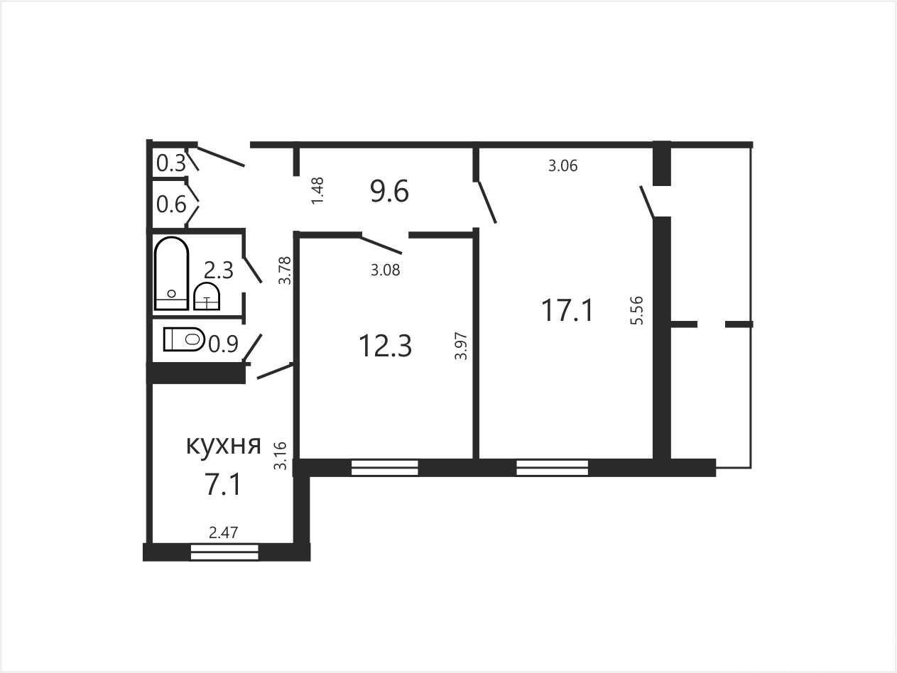 Комнаты раздельные: 12,1 м² и 17,3 м²
