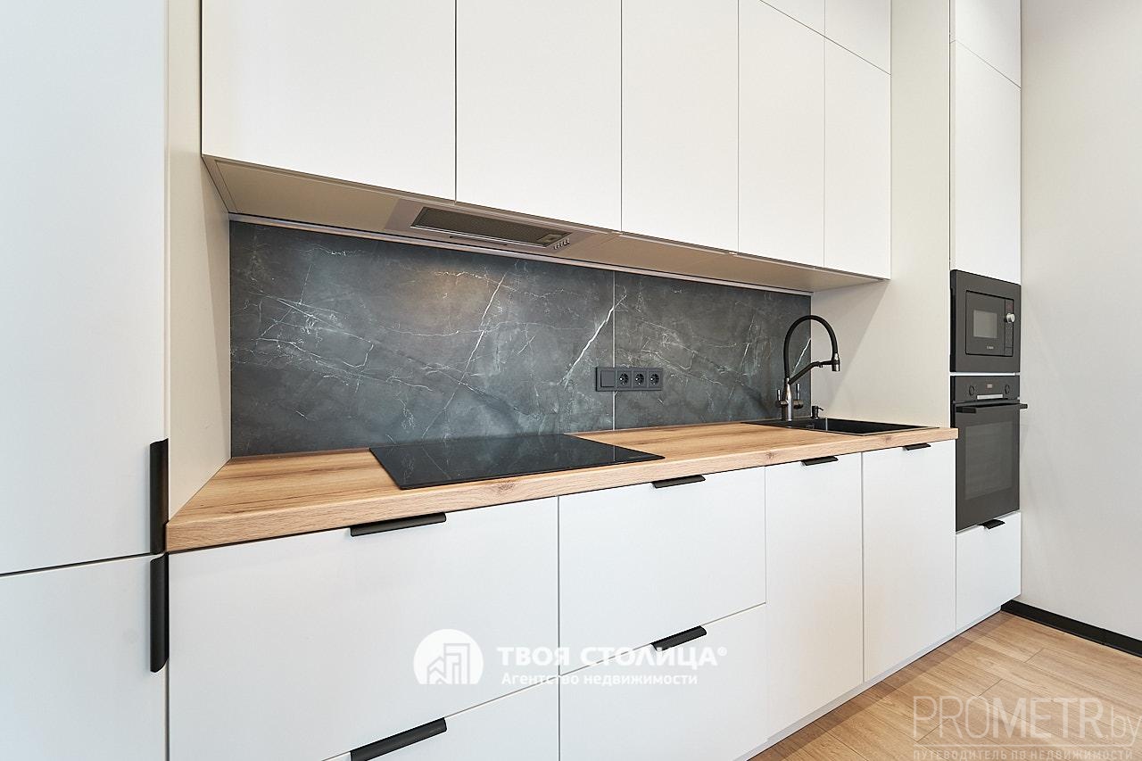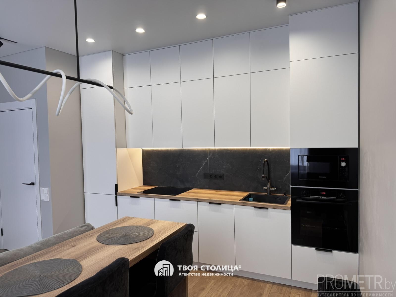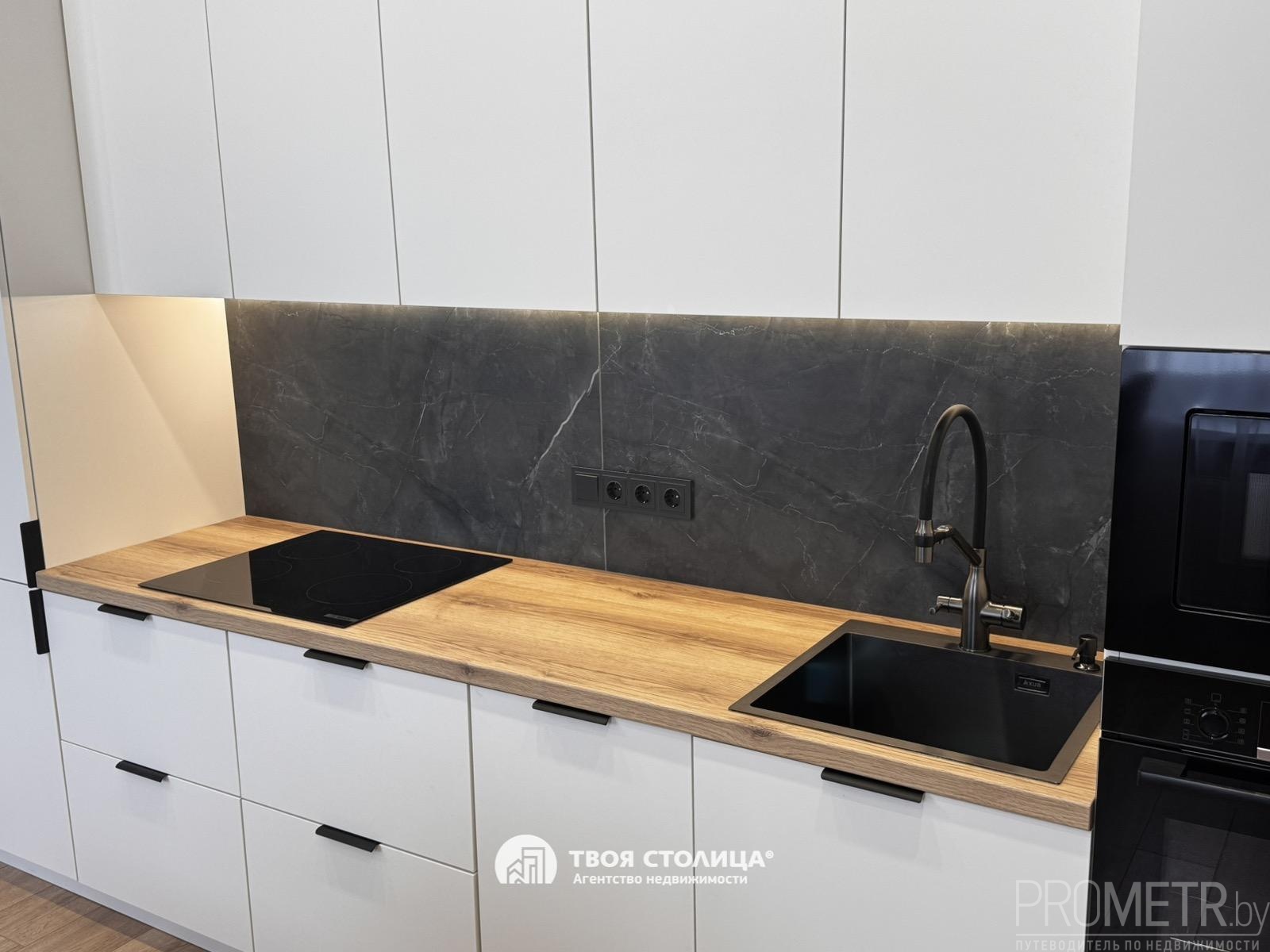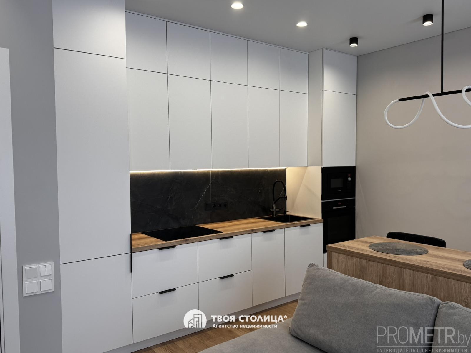 В гостиной кухонный гарнитур укомплектован индукционной плитой, духовым шкафом, микроволновой печью, вся техника фирмы BOSCH- Испания!
