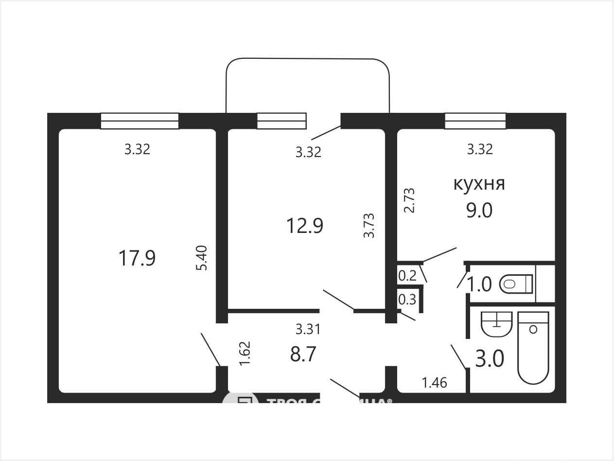 Общая площадь по СНБ 53.4 составляет 52,4 м², жилая — 30,2 м², кухня — 9 м². Высота потолков — 2,50 м.