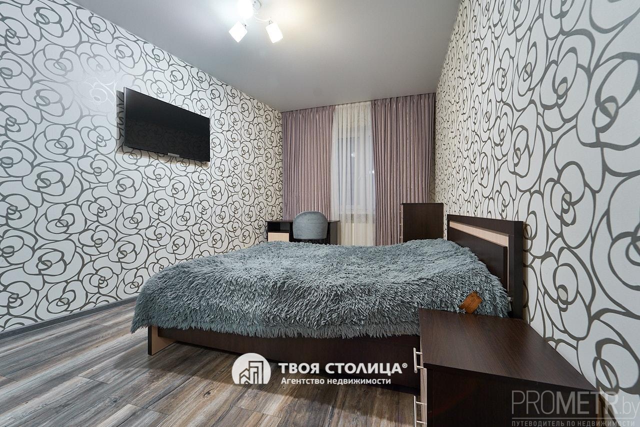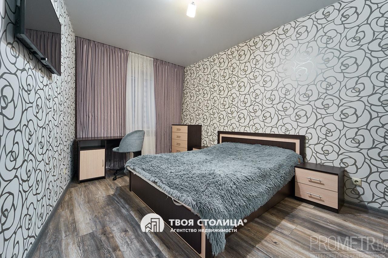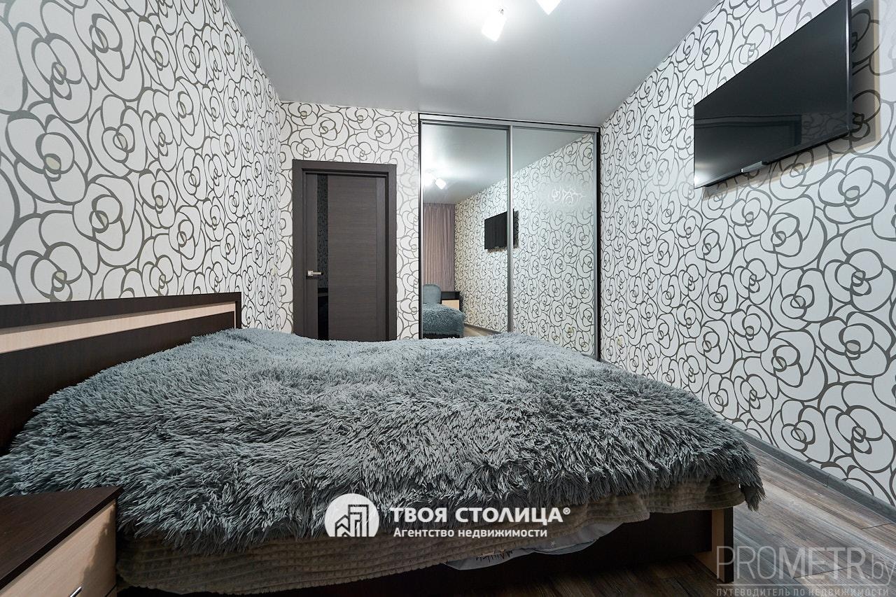 В спальне располагается вместительный встроенный шкаф и спальный гарнитур.