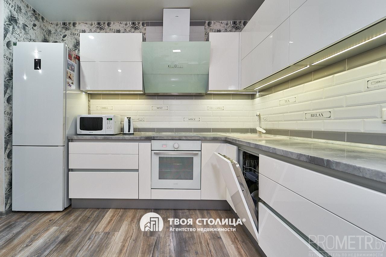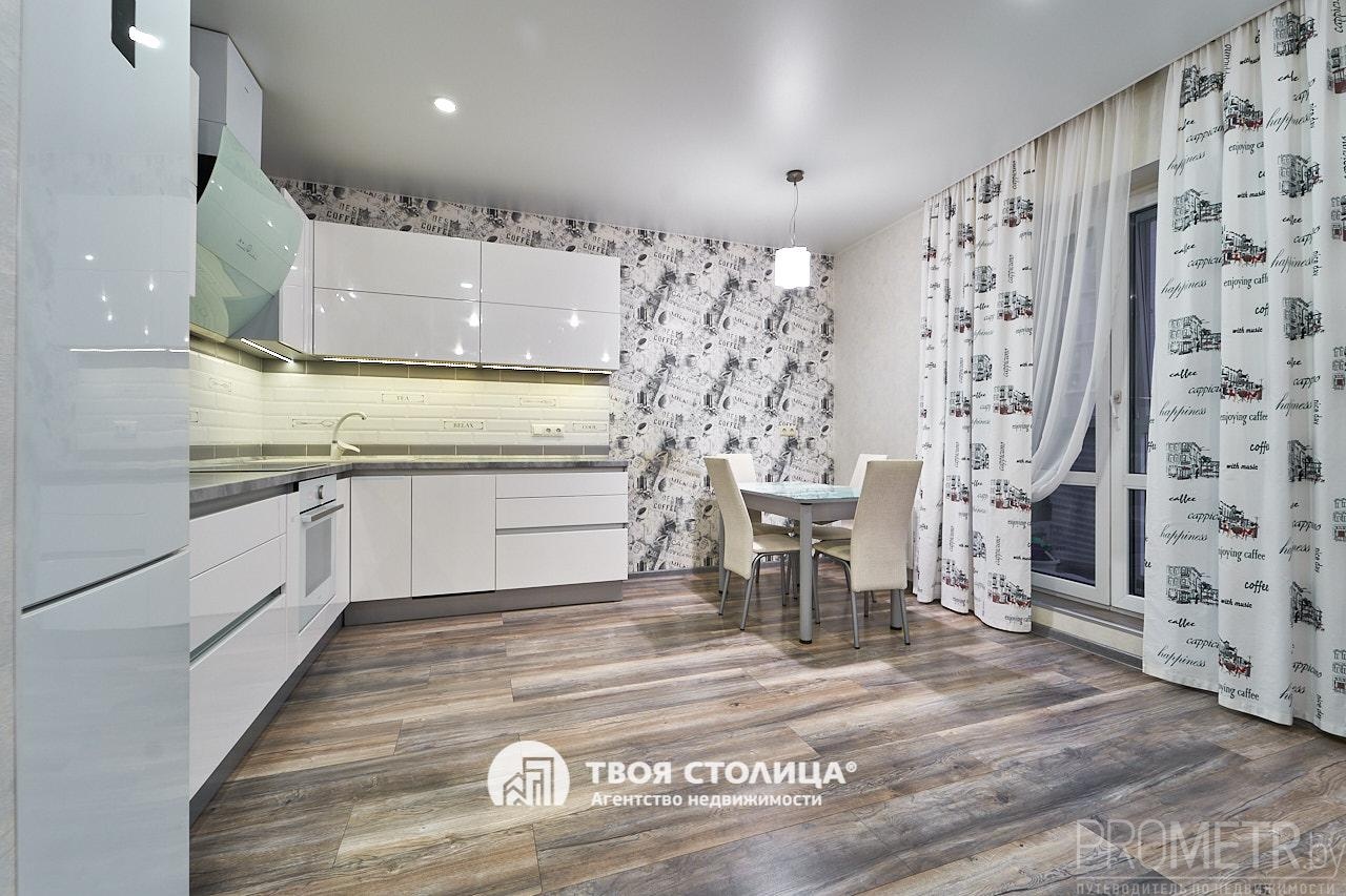 На полу в комнате, кухне-гостиной и прихожей - ламинат высокого класса износостойкости. Кухонный гарнитур выполнен из материалов премиум класса с фурнитурой Blum, установлена бытовая техника ведущих европейских производителей (Bosch, Gorenje).
