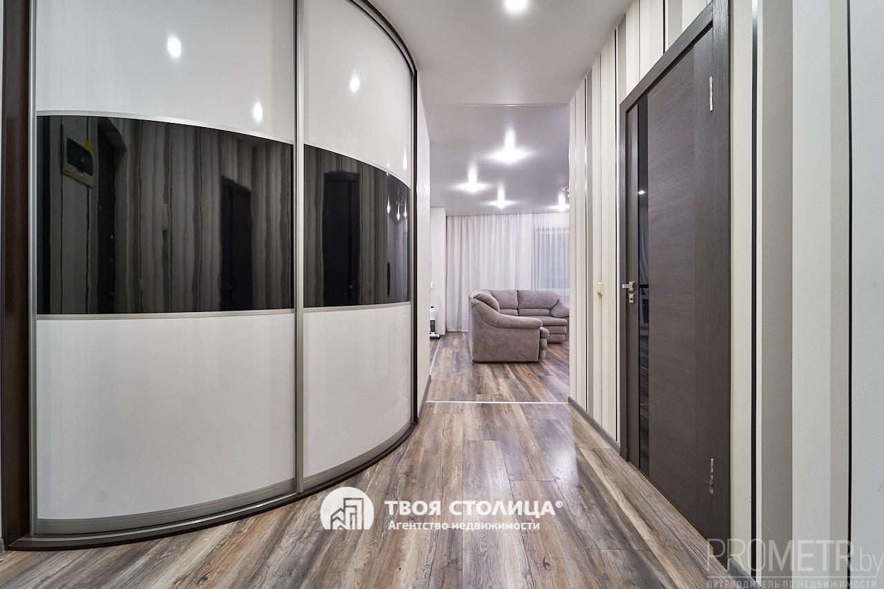 Второй санузел переоборудован в вместительную гардеробную с радиусным шкафом.