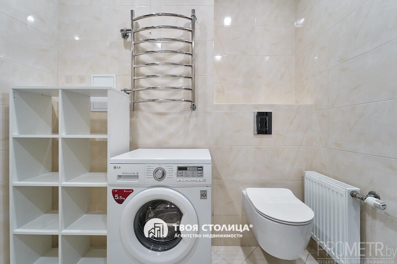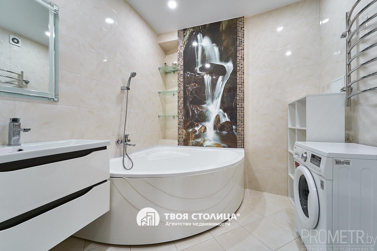 Большой совмещенный санузел (6,3 м²), облицован плиткой и оснащен современной сантехникой.
