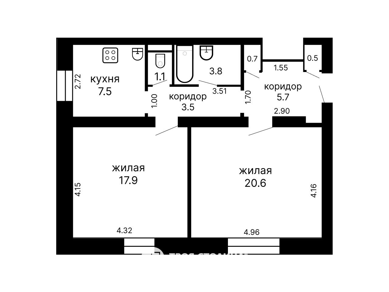Квартира расположена на первом этаже в кирпичном доме. Площадь квартиры 61.3 кв. м. Высота потолков 2.99 м. Изолированные жилые комнаты, большая кухня и коридор, раздельный санузел.