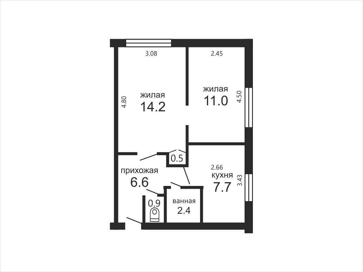 – Общая площадь – 43,3 м², жилая – 25,2 м², кухня – 7,7 м².