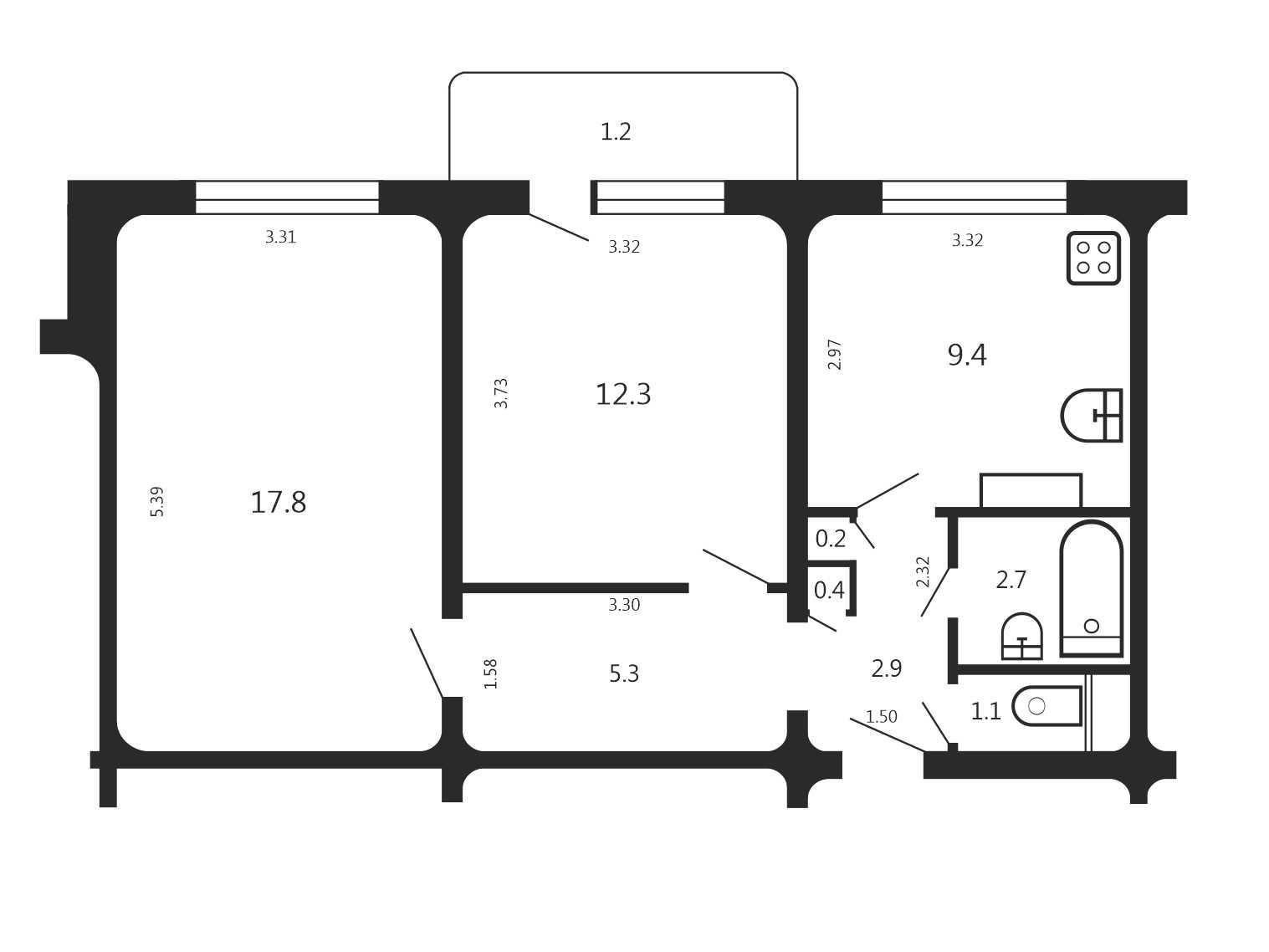 Общая площадь составляет 52.1 кв.м, из которых 30.1 кв.м приходится на жилые комнаты, а просторная кухня занимает 9.4 кв.м.
